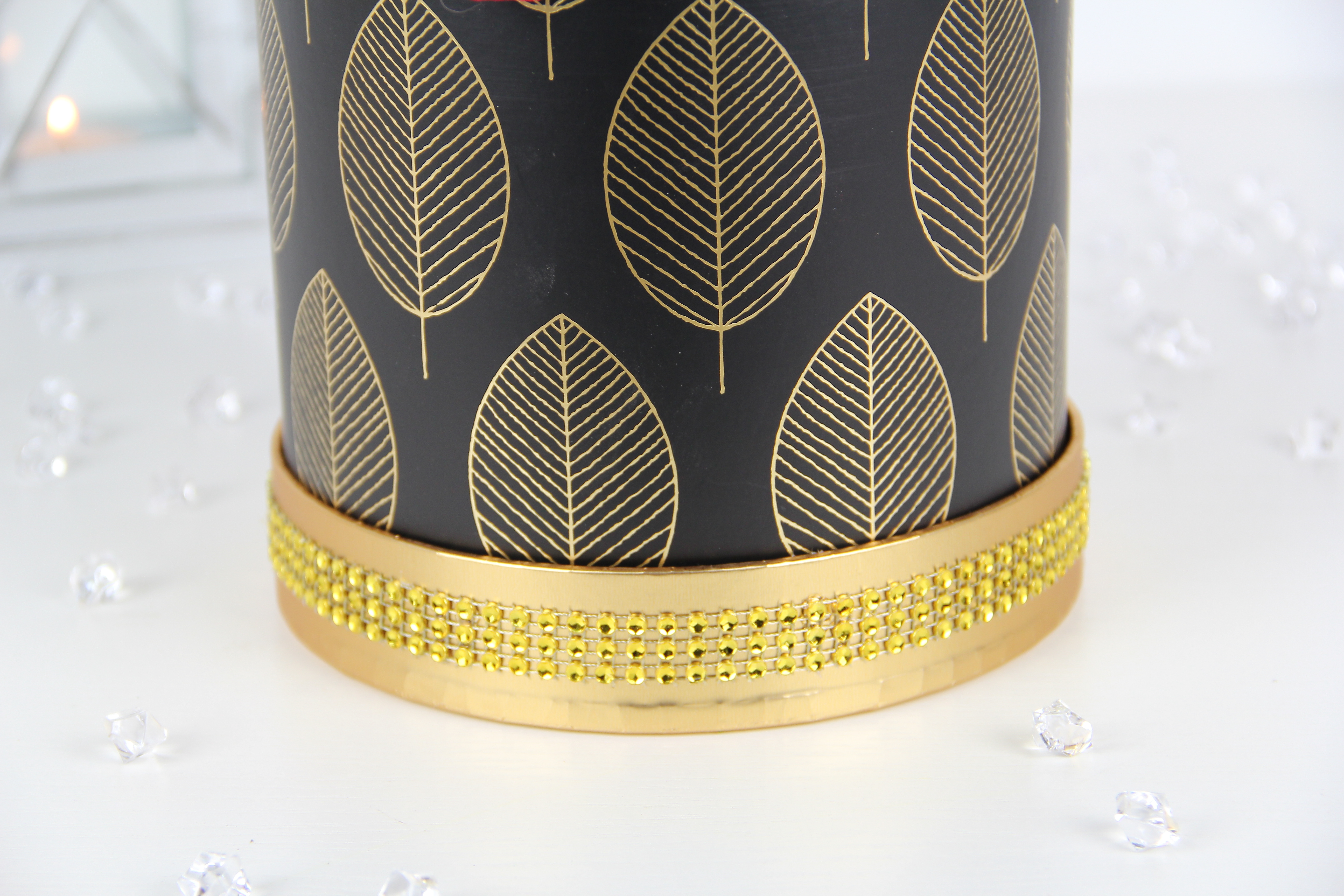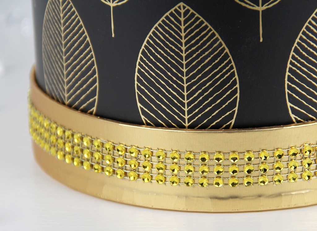Pudełko jest z serii średniej - rozmiar M wg. naszych oznaczeń. Kształt pudełka to klasyczna tuba w czarnym kolorze z aplikacją wzoru złotych listków. Na spodzie przymocowany jest dekielek, dookoła którego znajduje się pasek imitujący złote błyszczące cekiny.