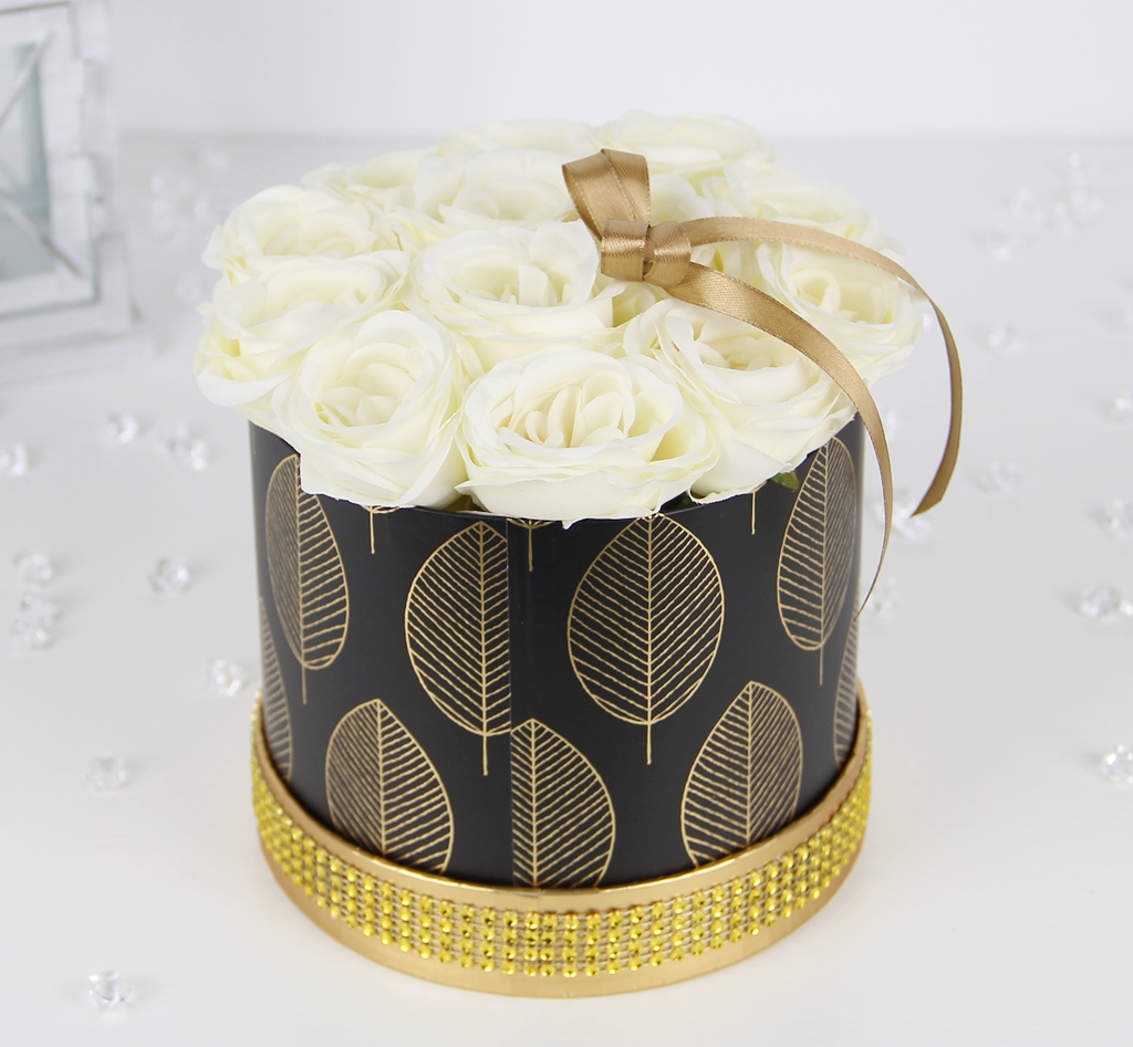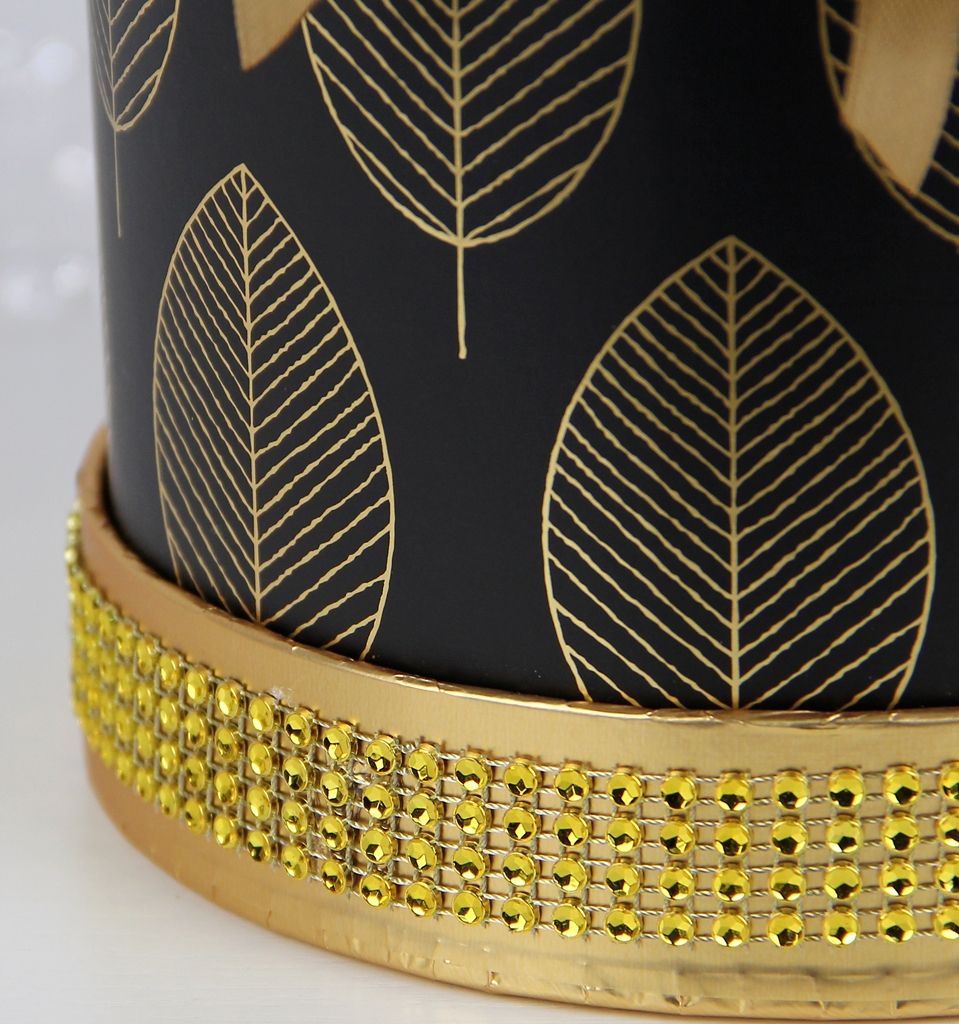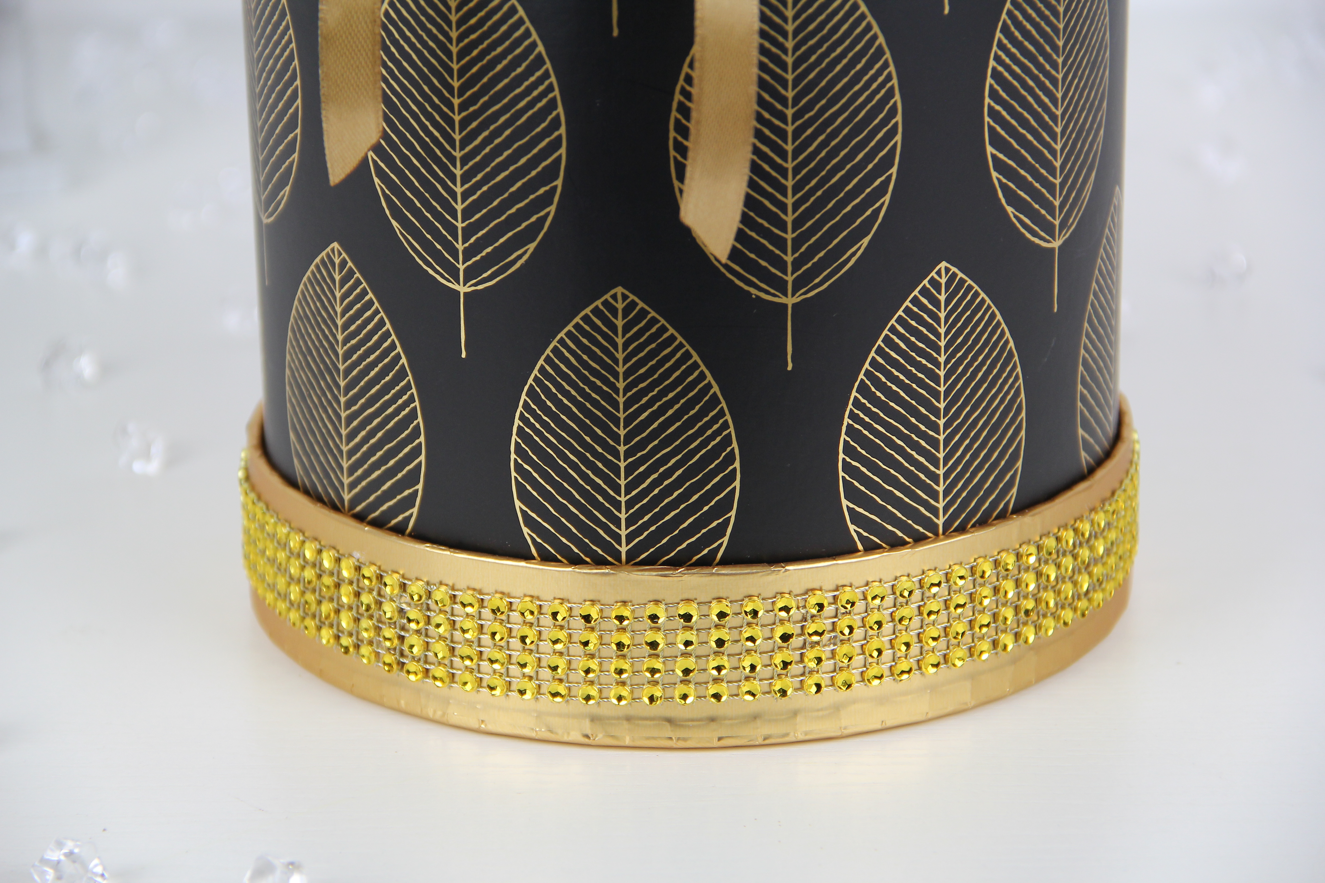 Pudełko jest z serii średniej - rozmiar M wg. naszych oznaczeń. Kształt pudełka to klasyczna tuba w czarnym kolorze z aplikacją wzoru złotych listków. Na spodzie przymocowany jest dekielek, dookoła którego znajduje się pasek imitujący złote błyszczące cekiny.