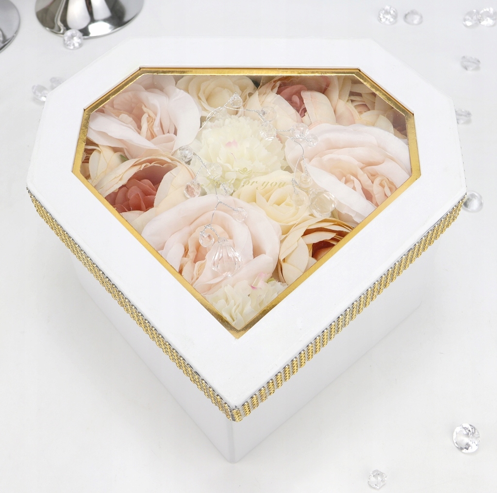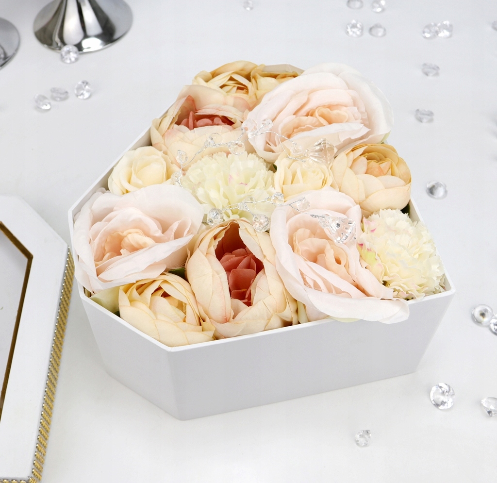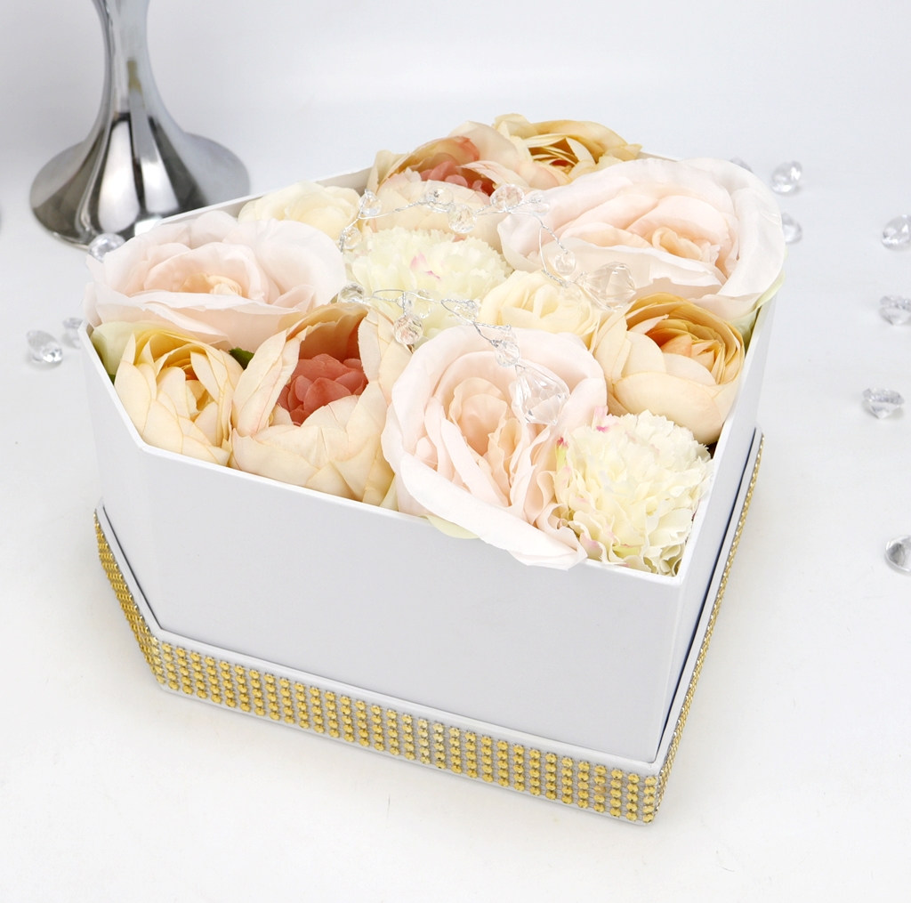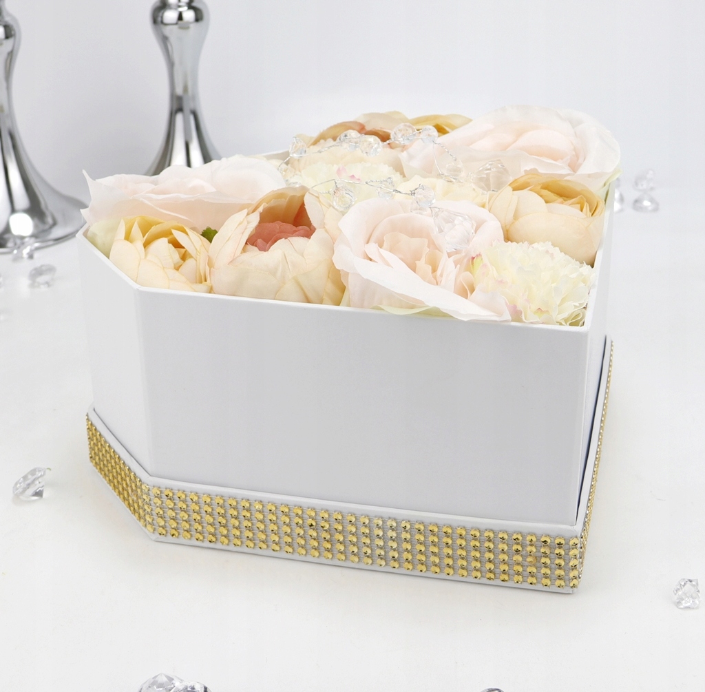 Podstawa bukietu, czyli pudełko jest z serii średniej- większej, w kształcie geometrycznego diamentu w jednolitym białym kolorze. Pudełko zakrywane jest dekielkiem z przeźroczystą szybką z tworzywa sztucznego, z nadrukowanym napisem, dookoła przymocowany jest złoty pasek imitujący cyrkonie. Pięknie błyszczy w świetle i podkreśla całą kompozycję.