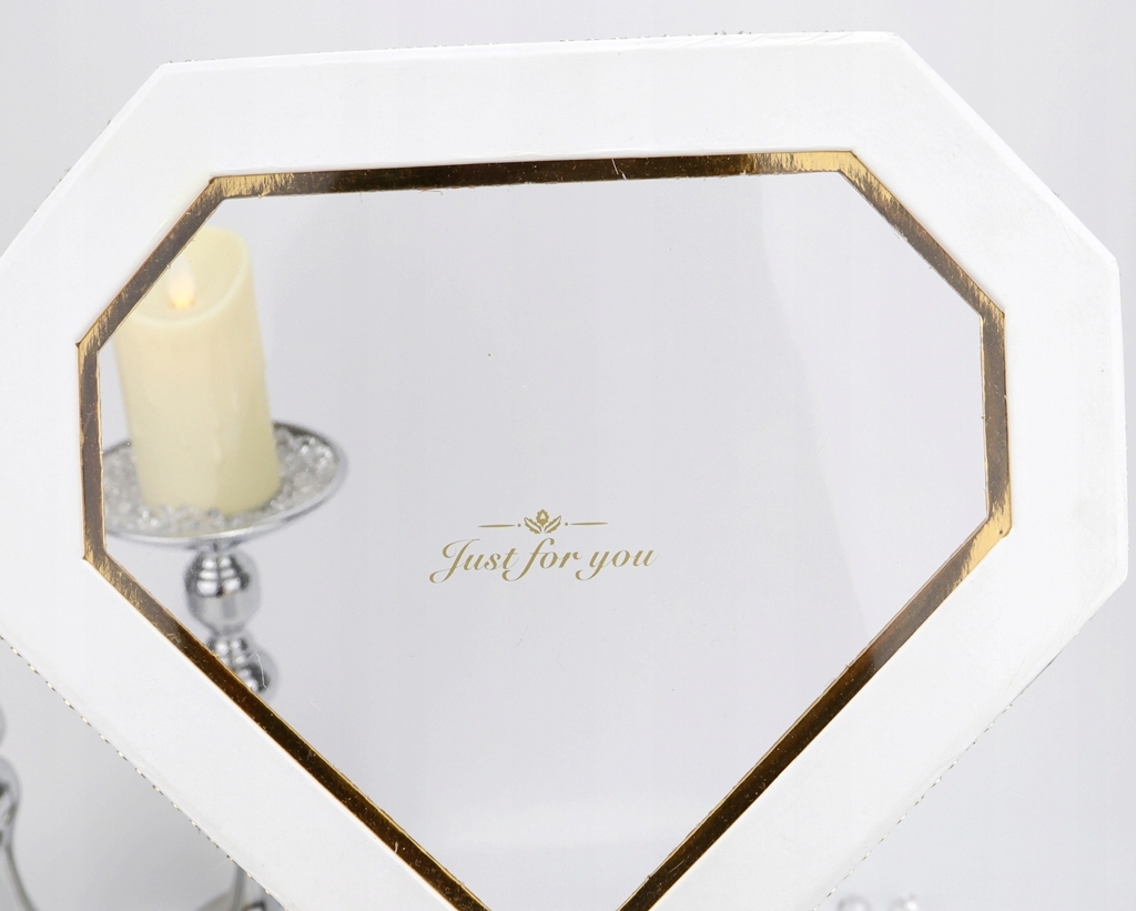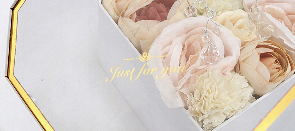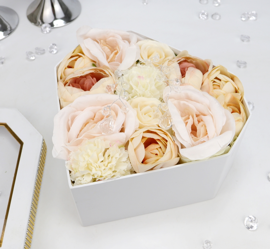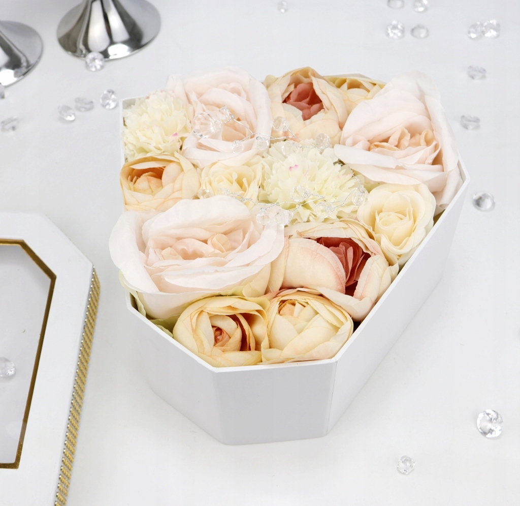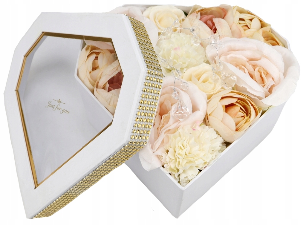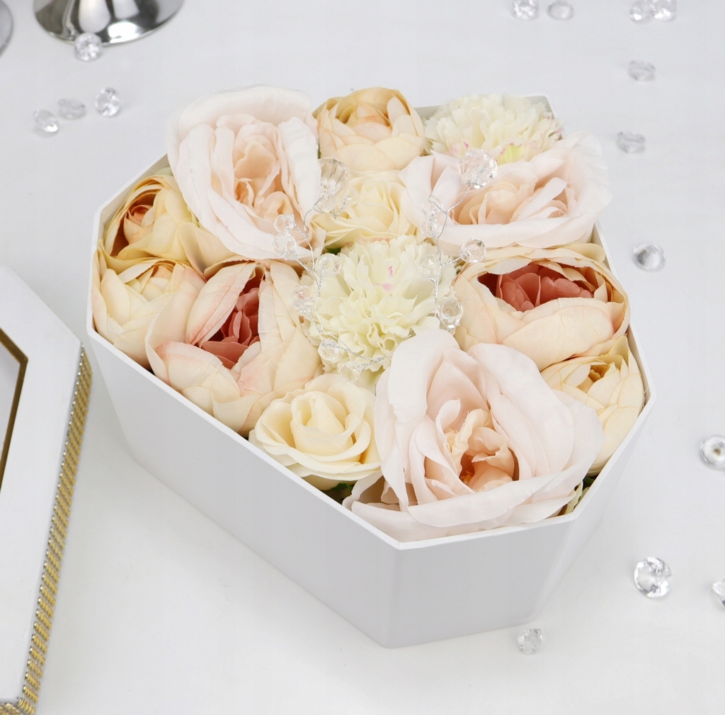 Podstawa bukietu, czyli pudełko jest z serii średniej- większej, w kształcie geometrycznego diamentu w jednolitym białym kolorze. Pudełko zakrywane jest dekielkiem z przeźroczystą szybką z tworzywa sztucznego, z nadrukowanym napisem, dookoła przymocowany jest złoty pasek imitujący cyrkonie. Pięknie błyszczy w świetle i podkreśla całą kompozycję.