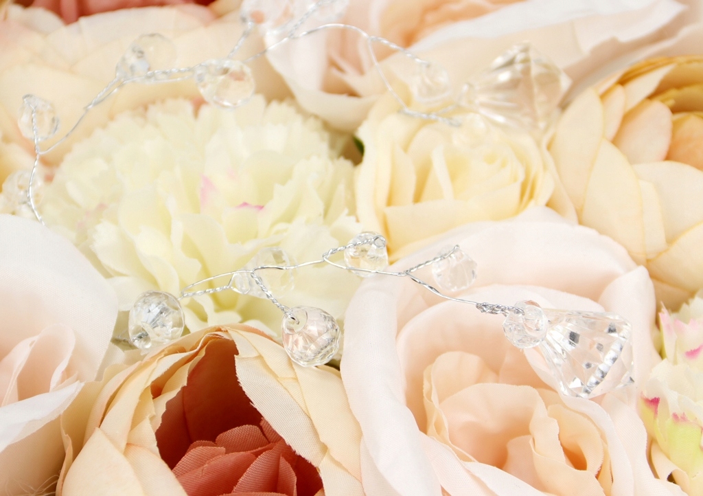 Z pomiędzy kwiatów wychodzą ozdobne sznury z akrylowymi kryształami w kształcie diamencików. Delikatnie połyskują na kwiatach dodając im uroku.