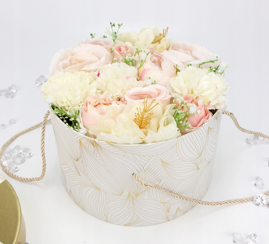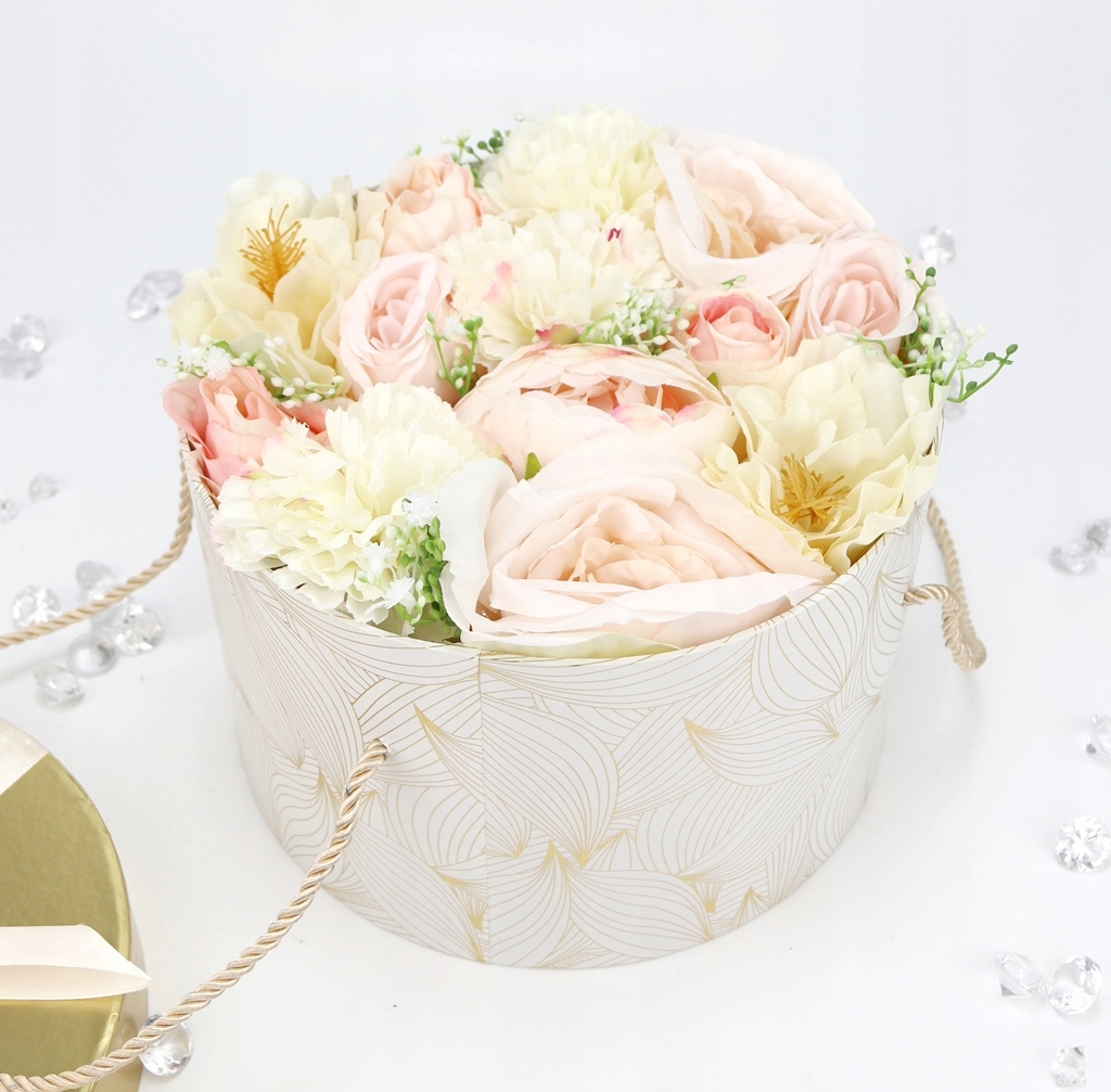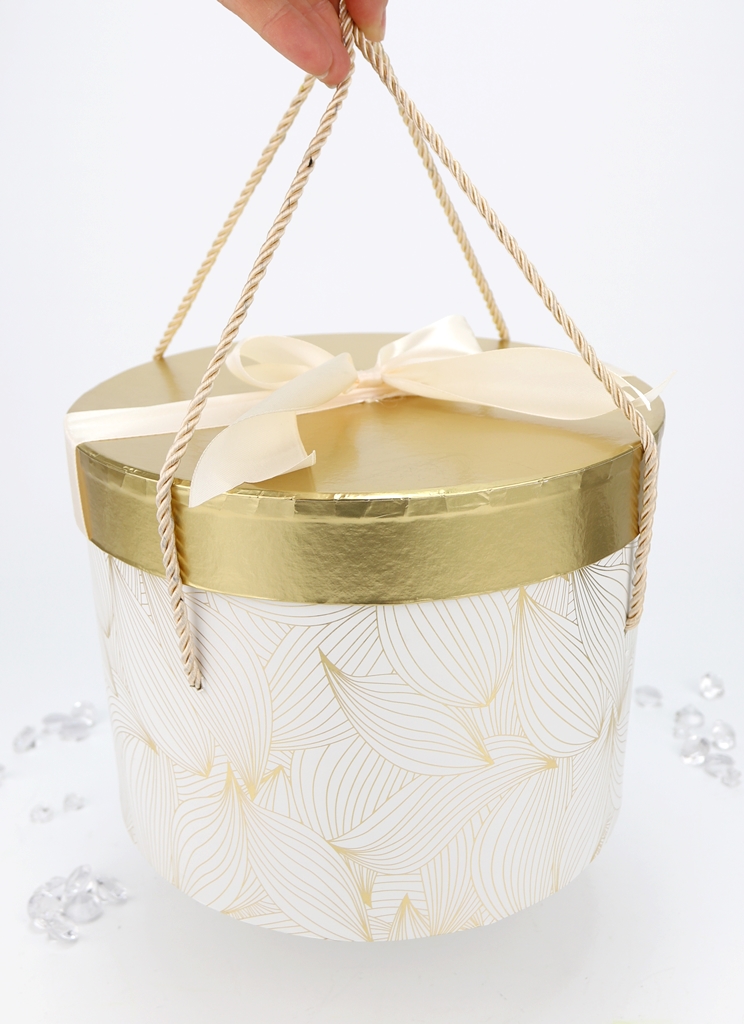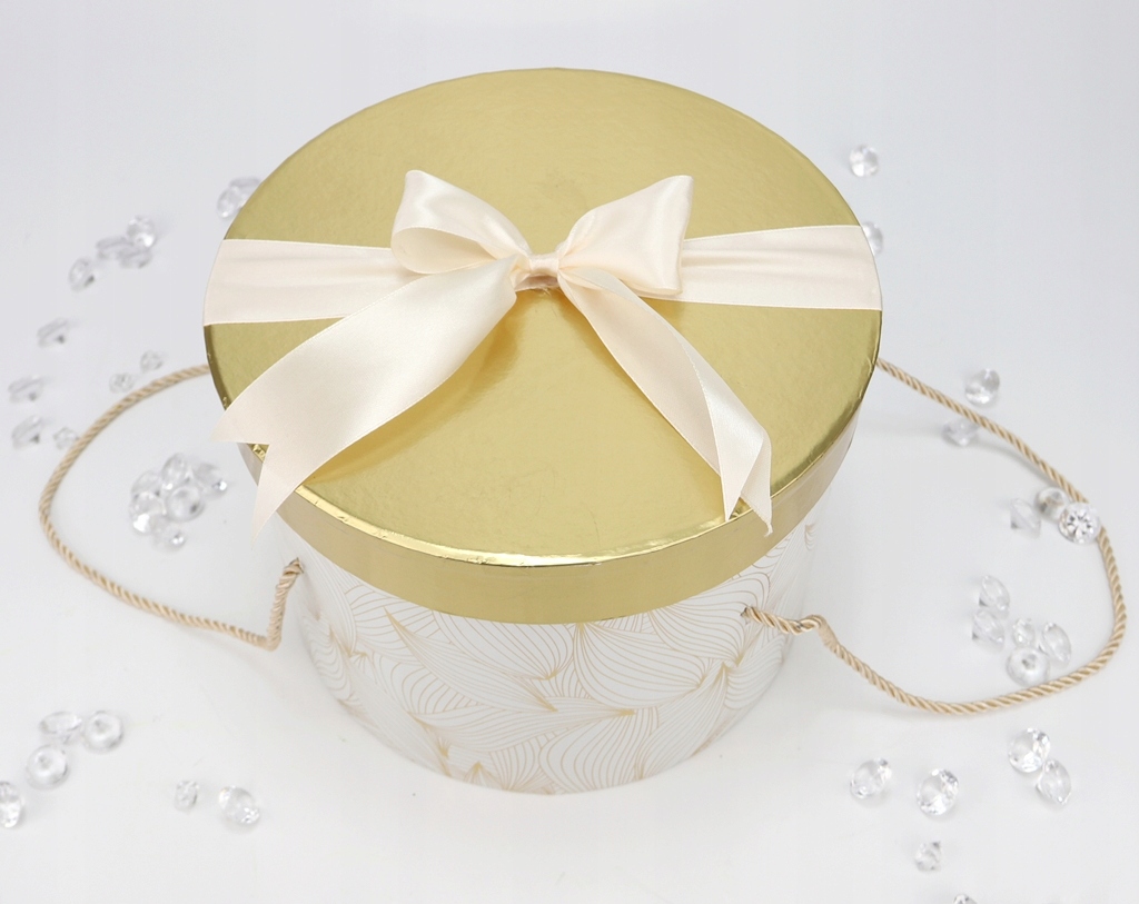 Podstawa bukietu, czyli pudełko jest z serii większej, w kształcie klasycznej tuby, w białym kolorze ze złotym wzorem liści.