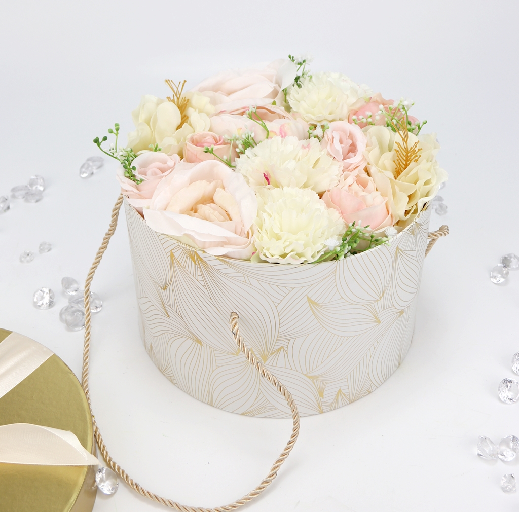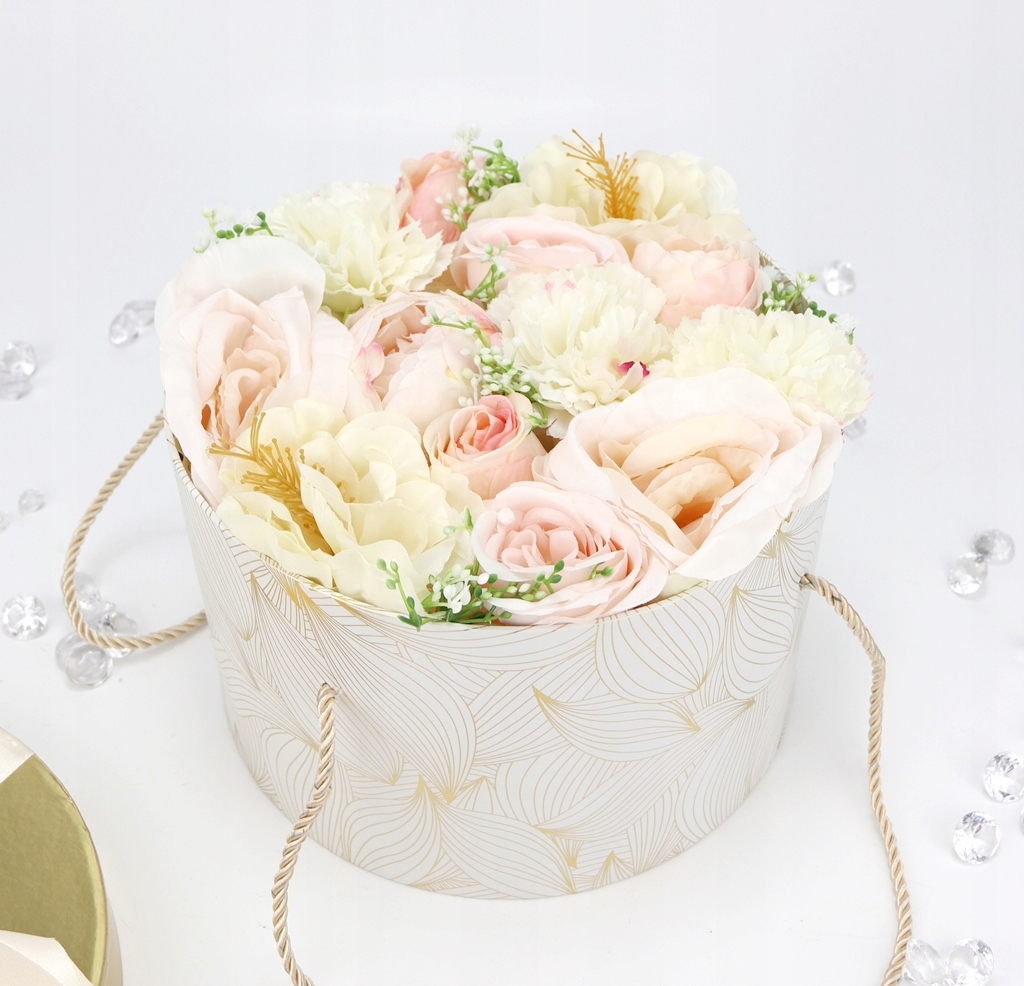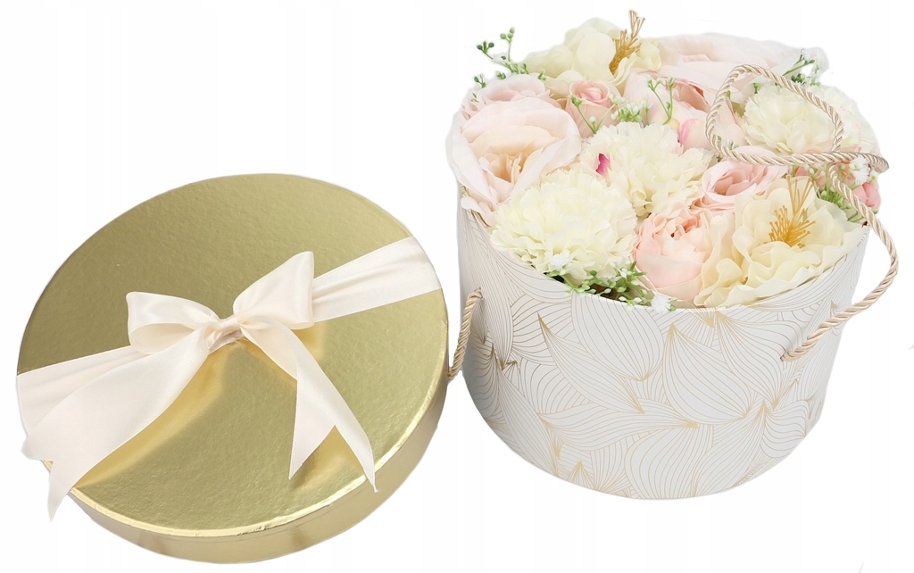 Podstawa bukietu, czyli pudełko jest z serii większej, w kształcie klasycznej tuby, w białym kolorze ze złotym wzorem liści.