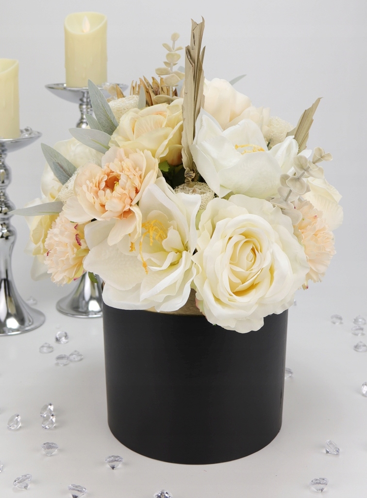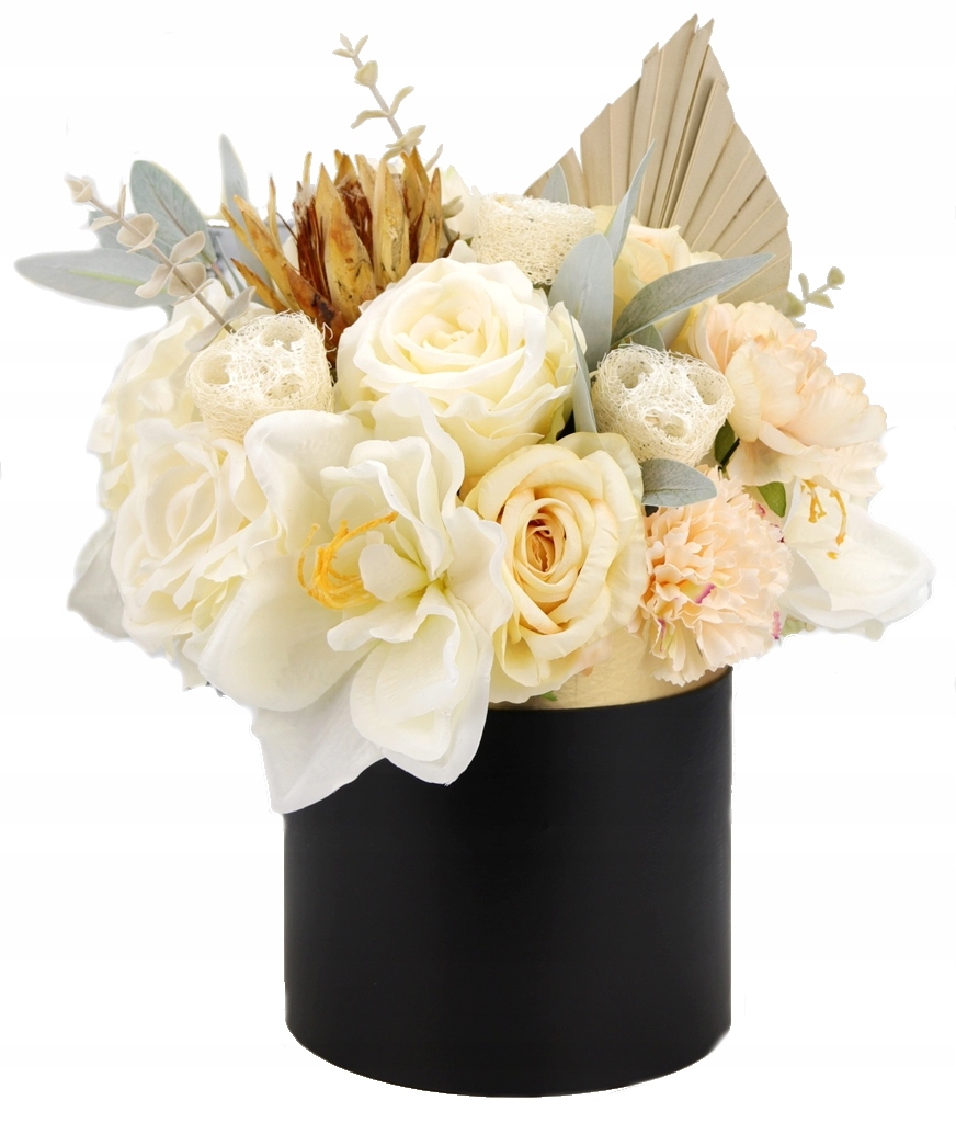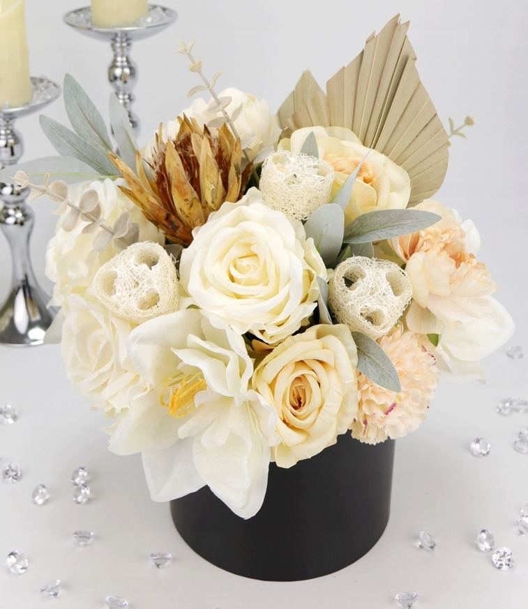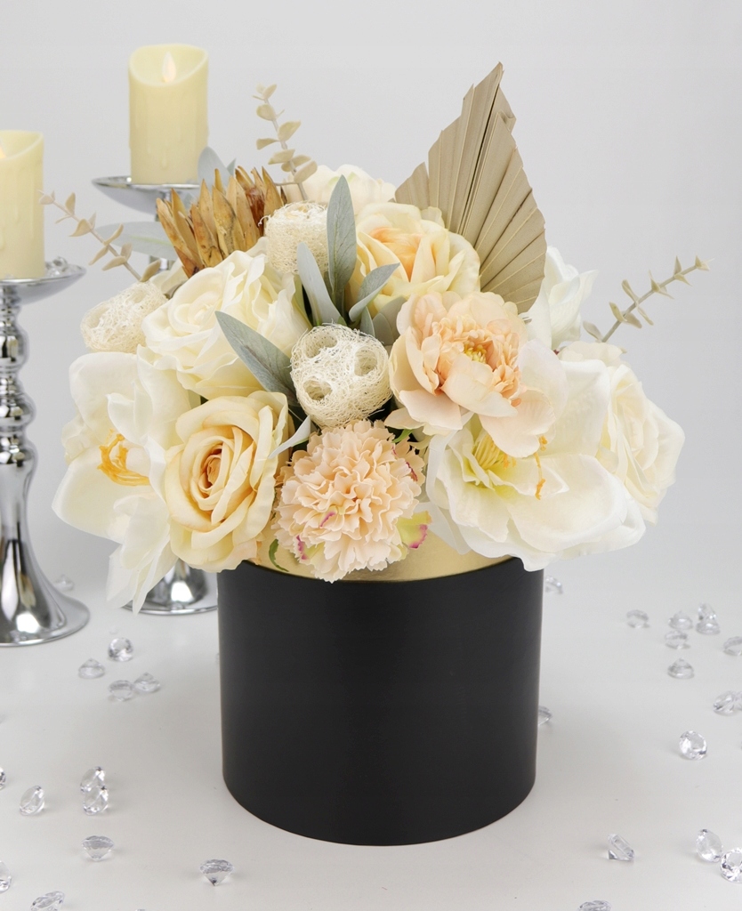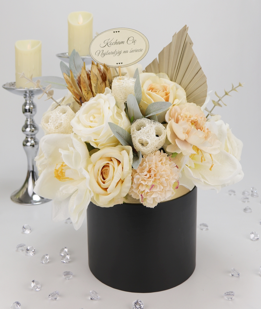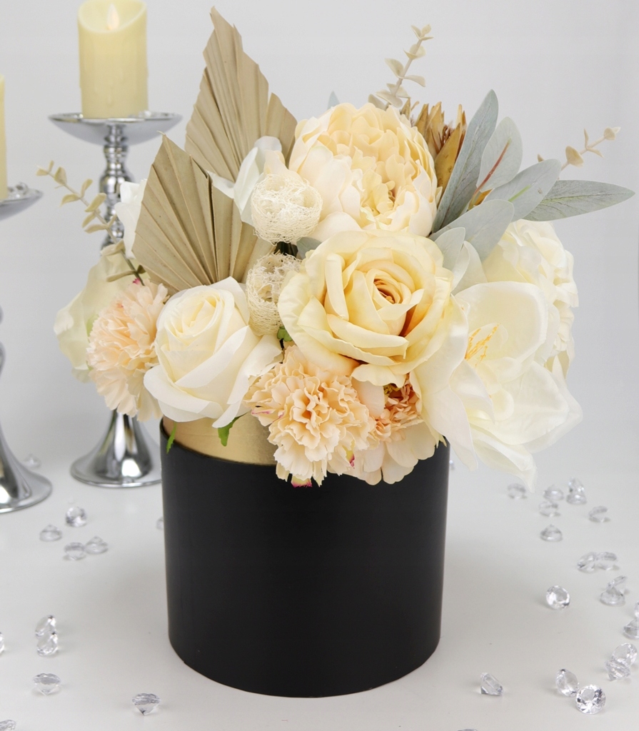 Niesamowity jasno kremowy bukiet w eleganckim czarno-złotym pudełku! Klasa sama w sobie.