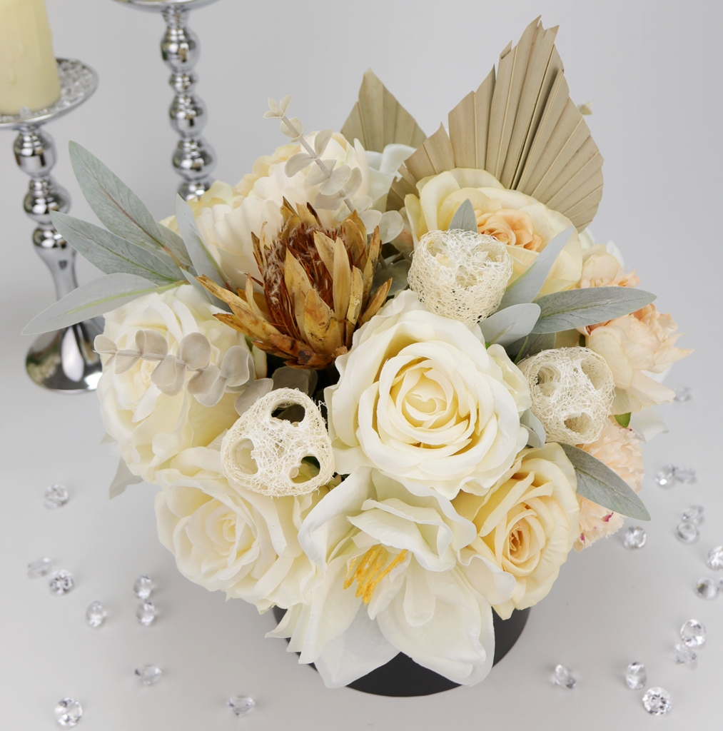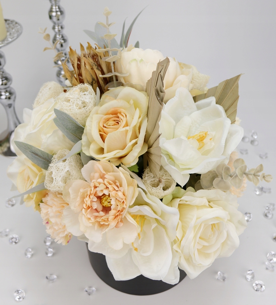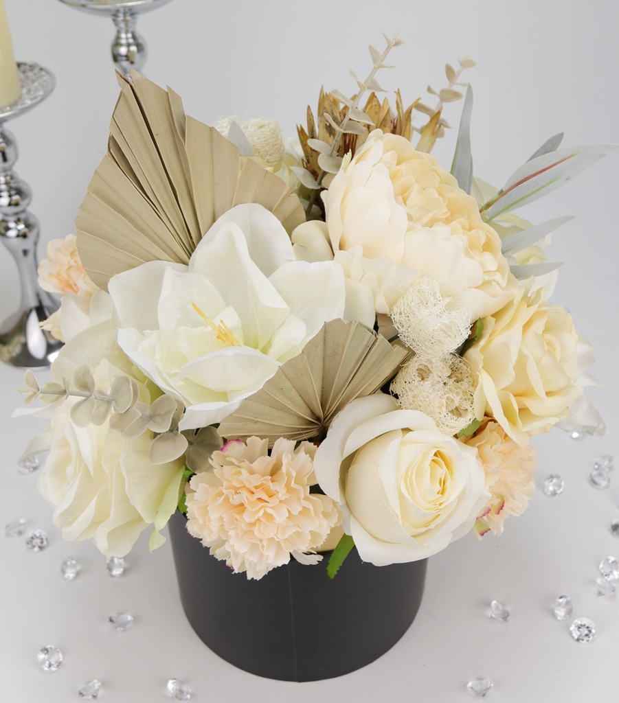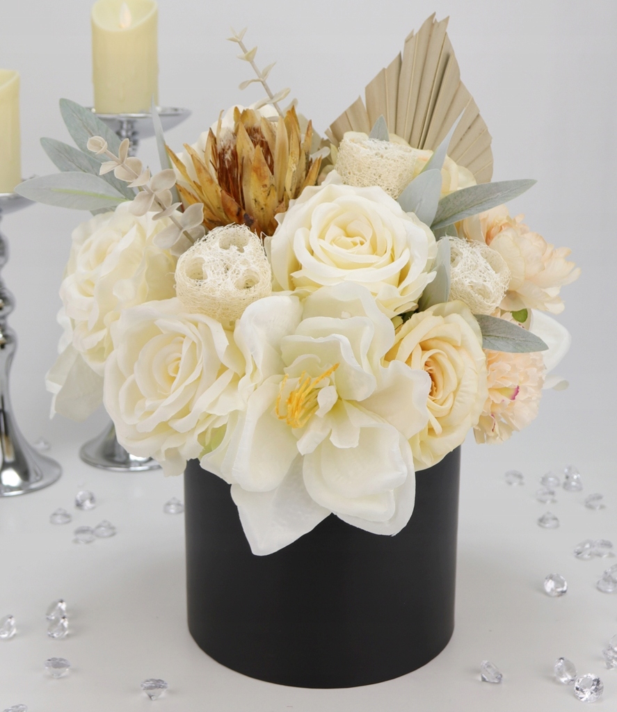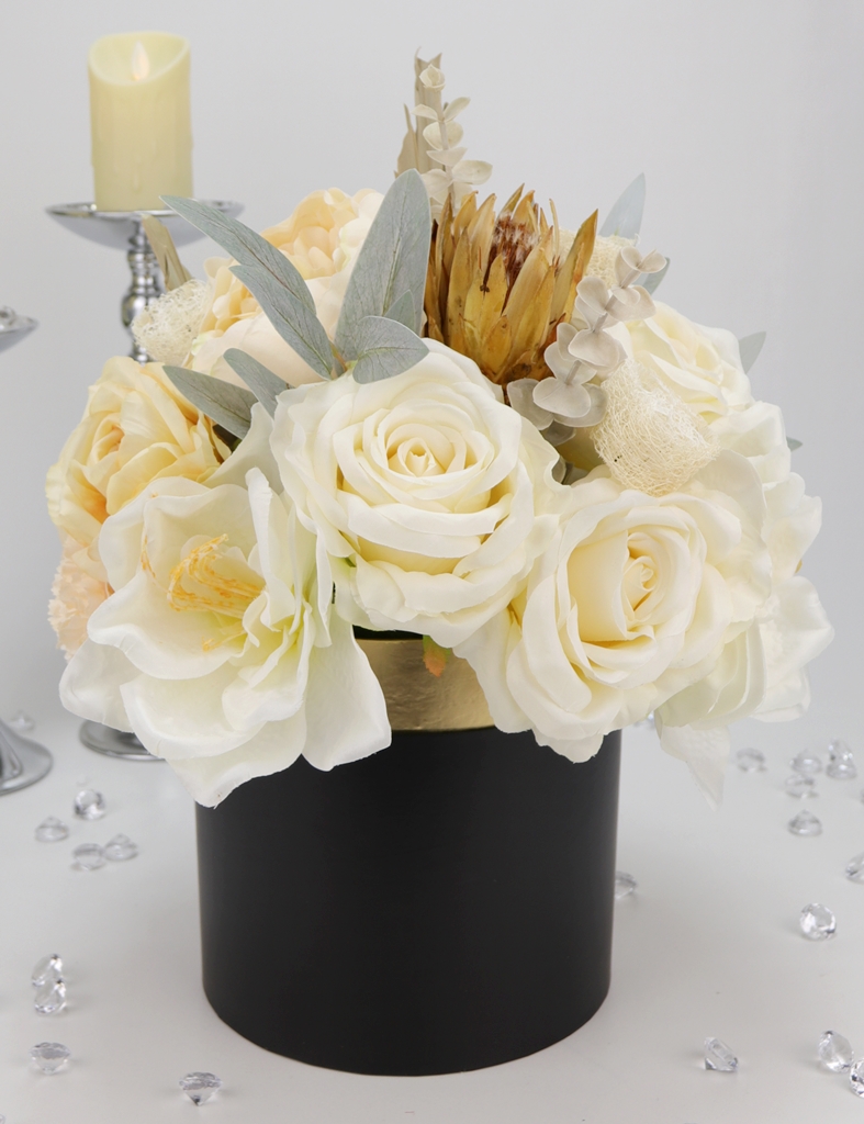 Niesamowity jasno kremowy bukiet w eleganckim czarno-złotym pudełku! Klasa sama w sobie.