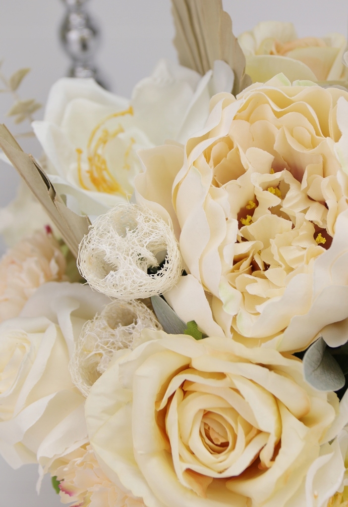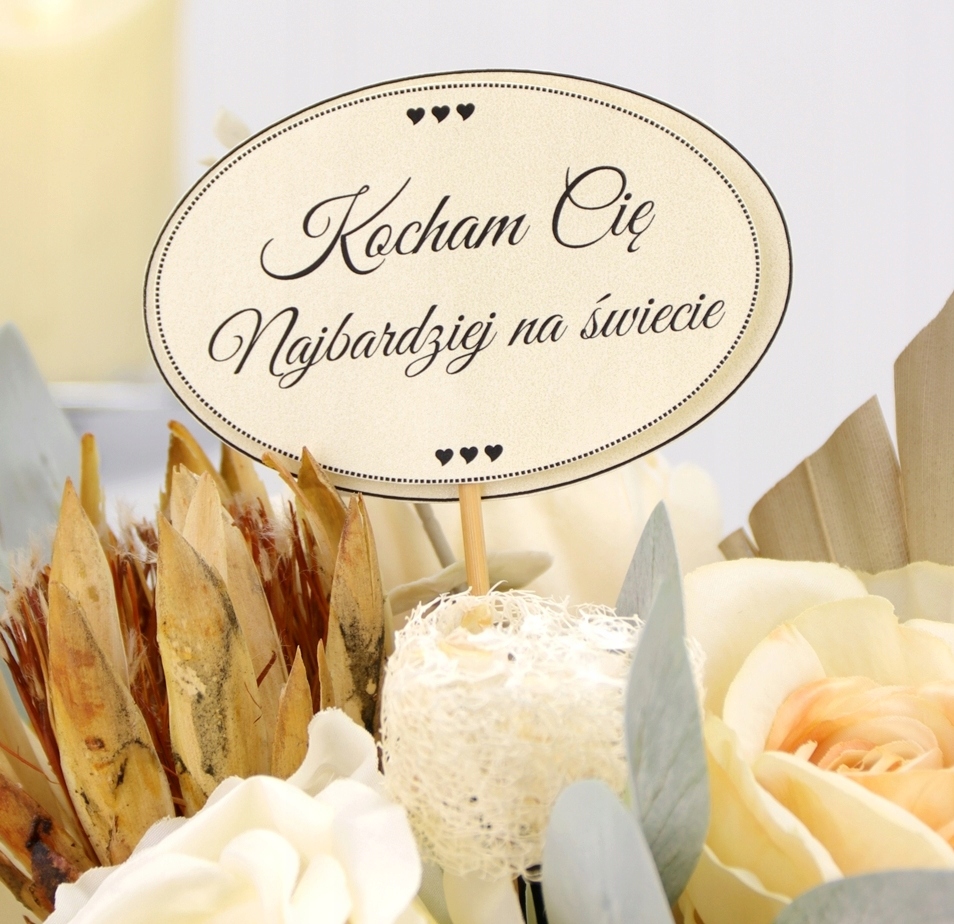 Bukiet składa się z wysokiej jakości kwiatów materiałowych i dodatków:
