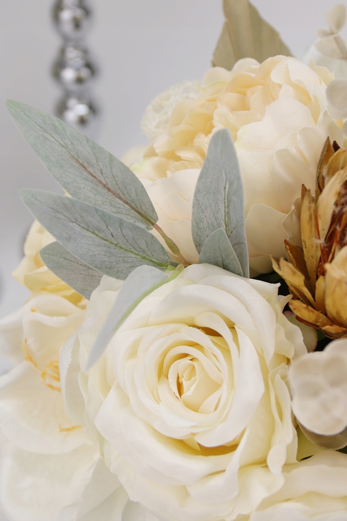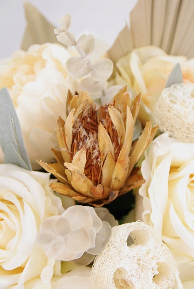 Wszystkie elementy są mocowane na stałe za pomocą drutu florystycznego oraz termo-kleju, co gwarantuje stabilność i wytrzymałość kompozycji.