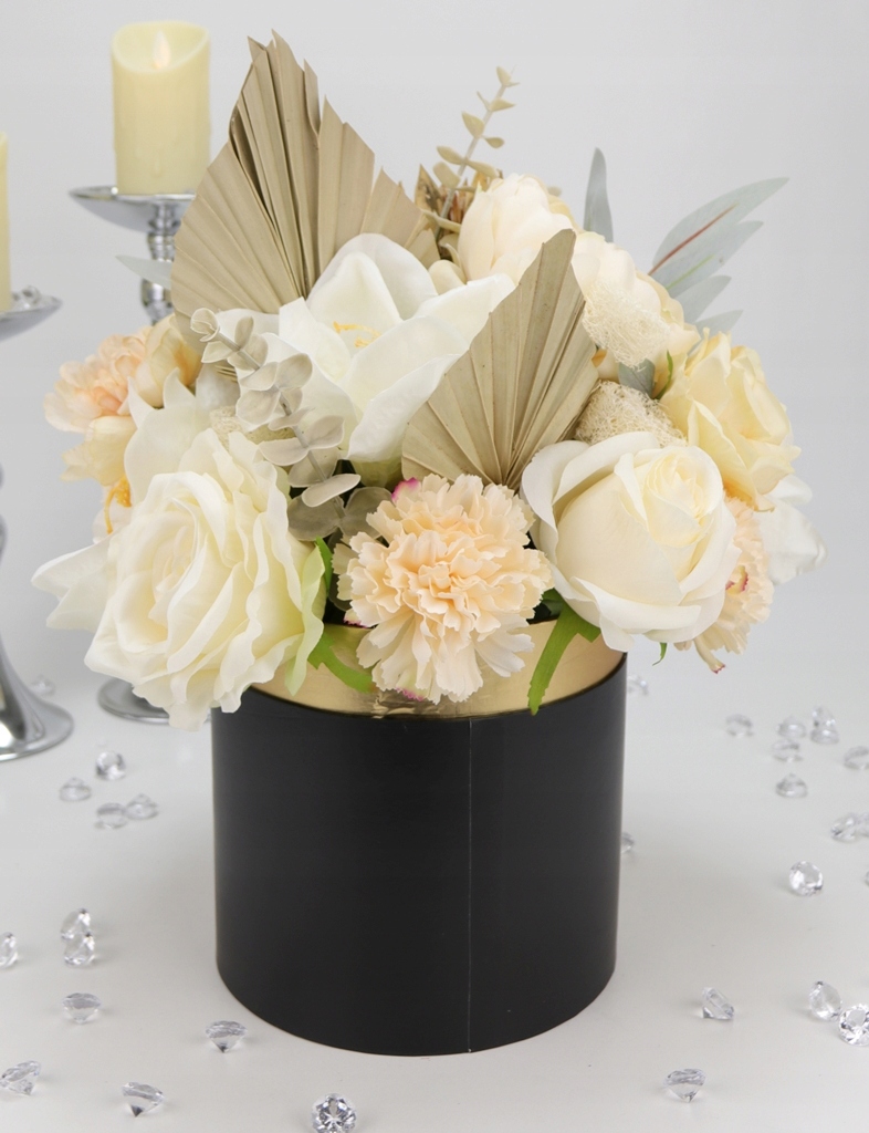 Podstawa bukietu, czyli pudełko jest z serii większej, o kształcie klasycznej tuby. Głównym kolorem jest jednolity czarny w pół-macie. Górny rant jest w satynowym złocie, który delikatnie odbija światło i elegancko podkreśla kwiaty.
