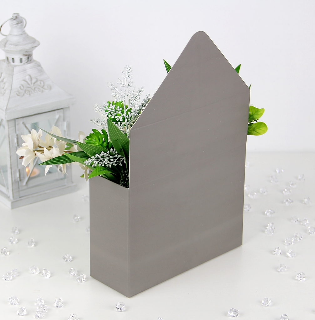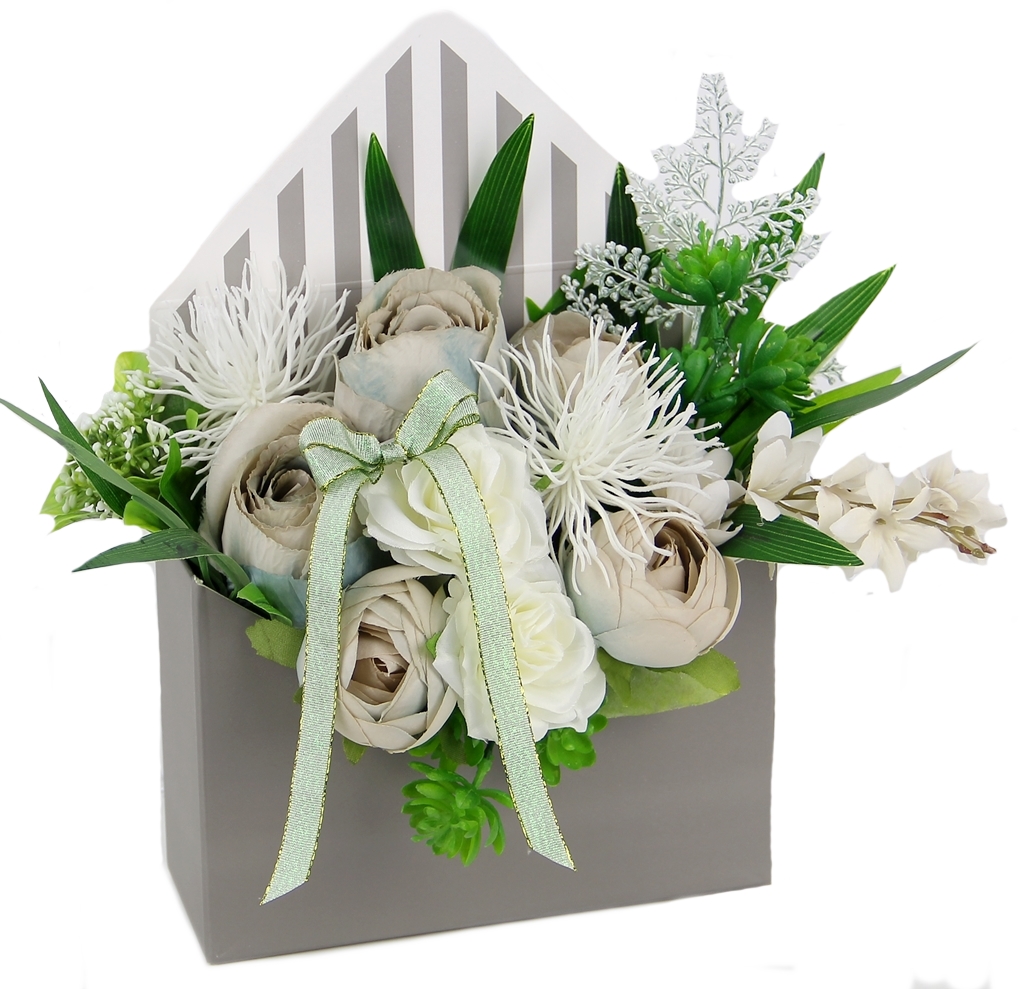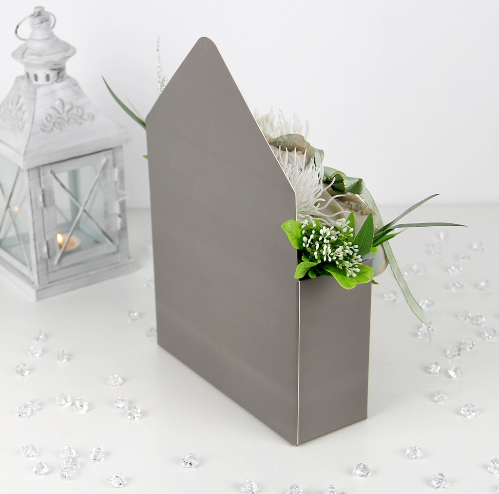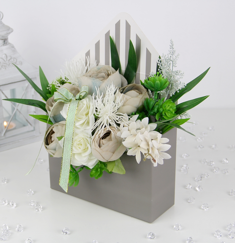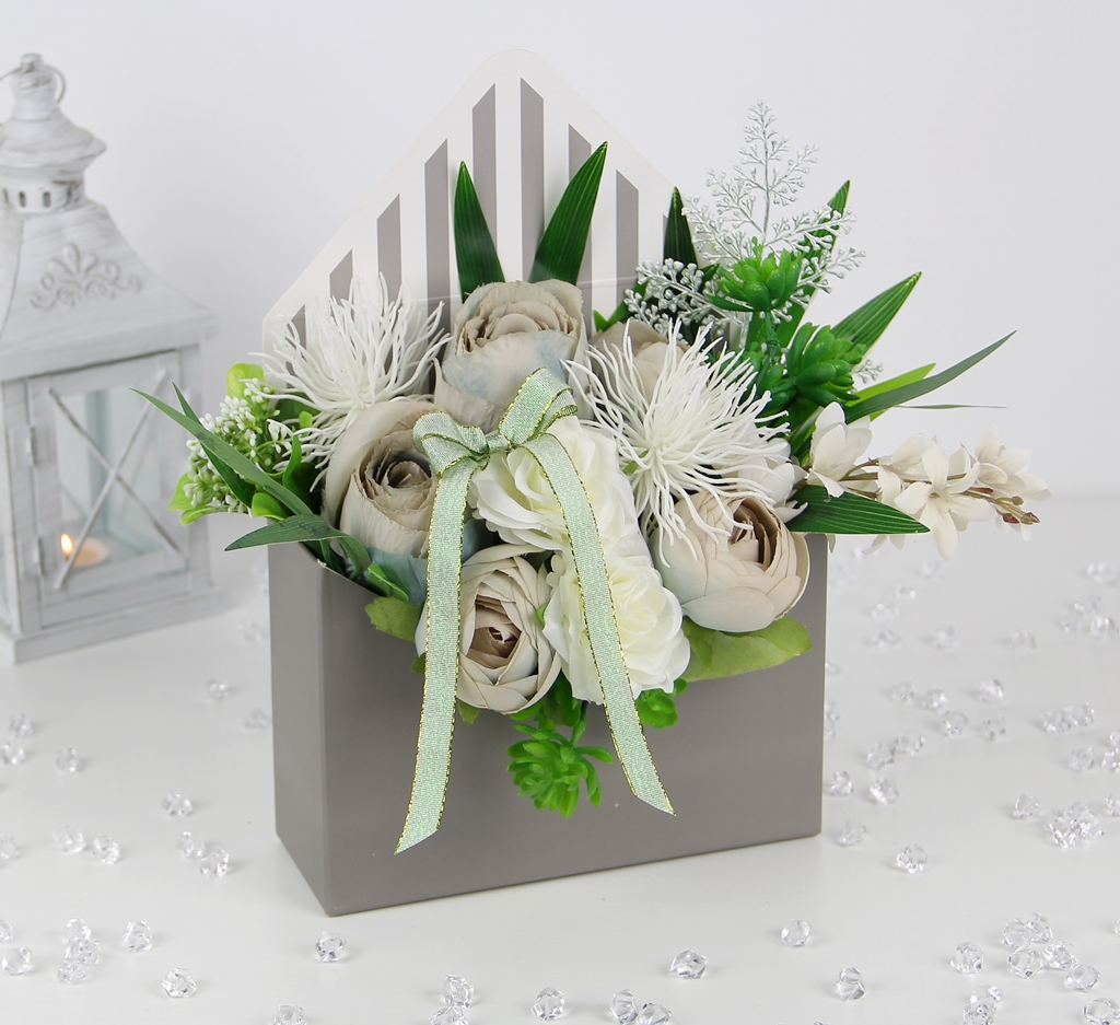 Pudełko ma kształt klasycznej otwartej koperty. Głównymi kolorami są szary i biały, który tworzy pionowe pasiaste tło dla kwiatów.