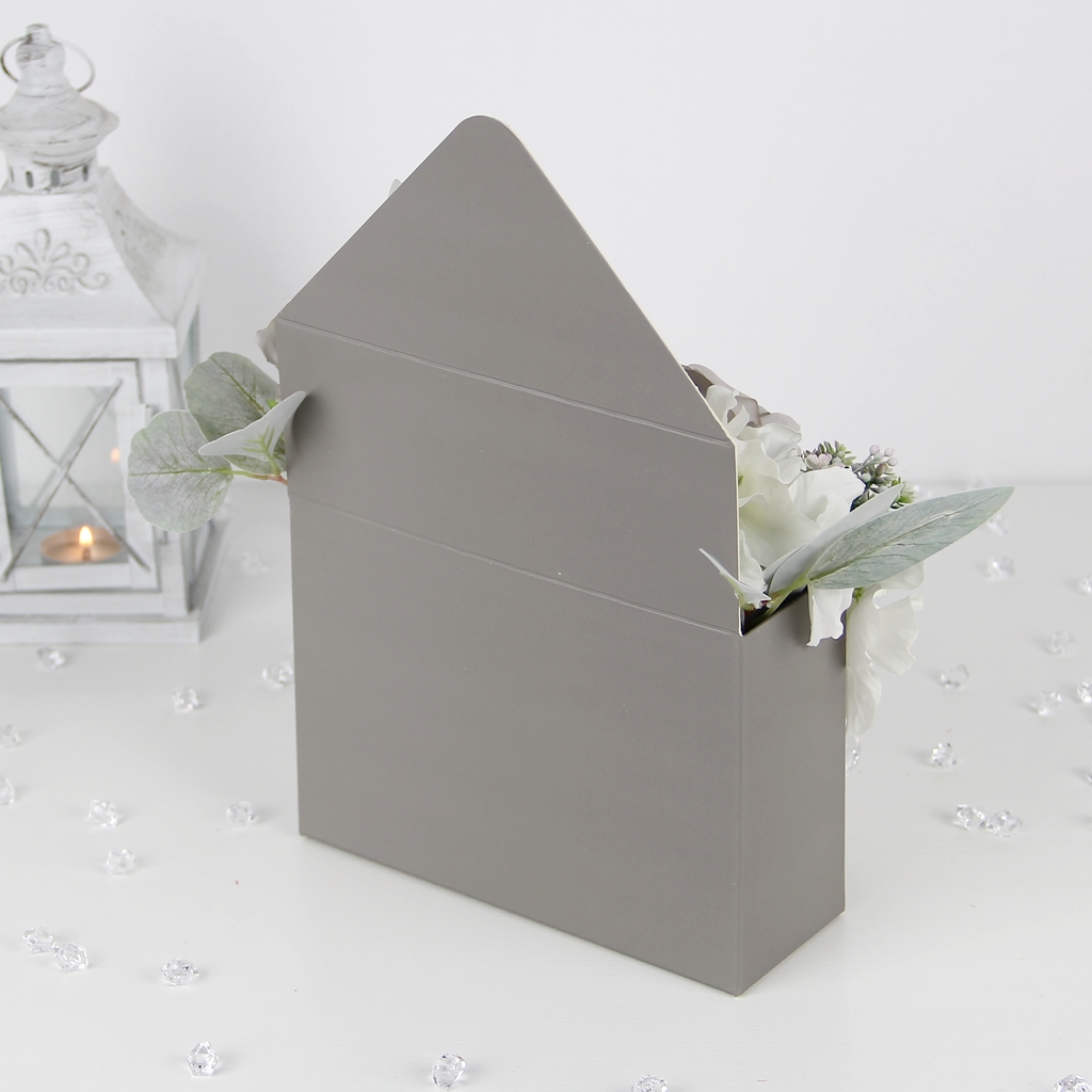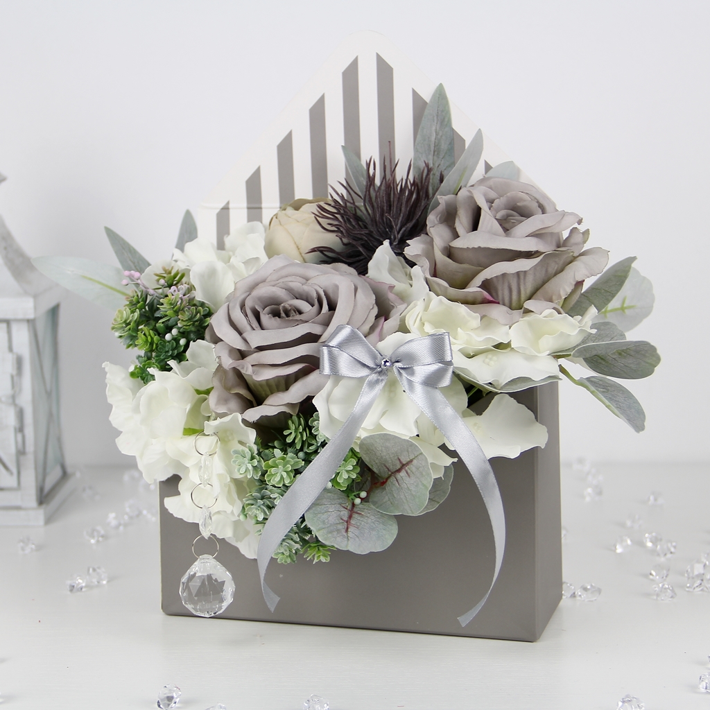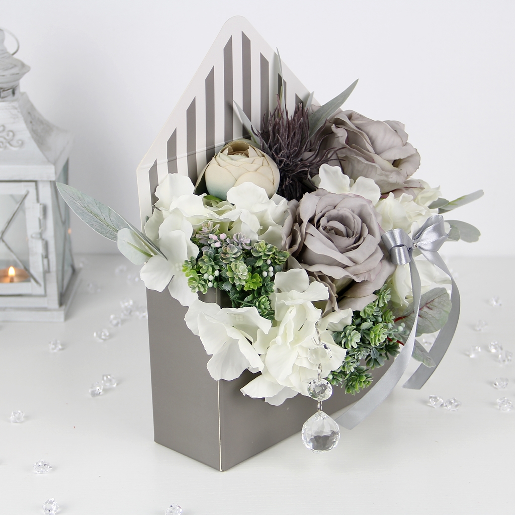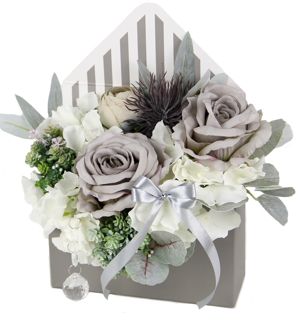 Pudełko ma kształt klasycznej otwartej koperty. Głównymi kolorami są szary i biały, który tworzy pionowe pasiaste tło dla kwiatów.