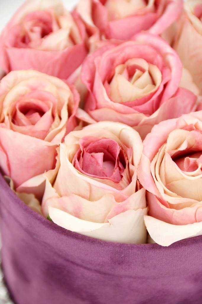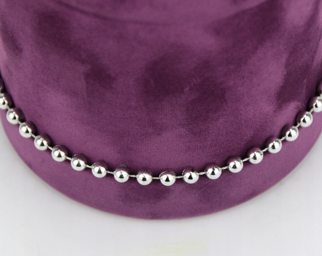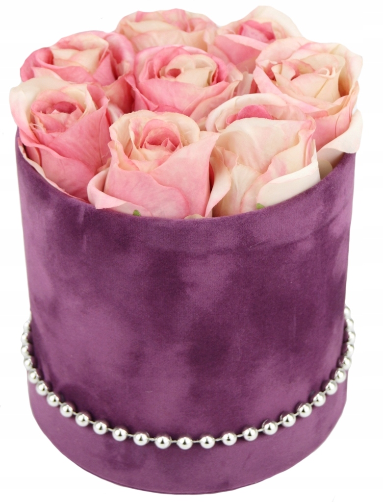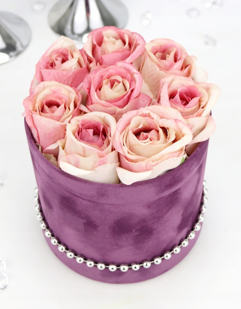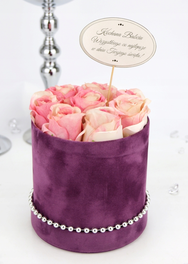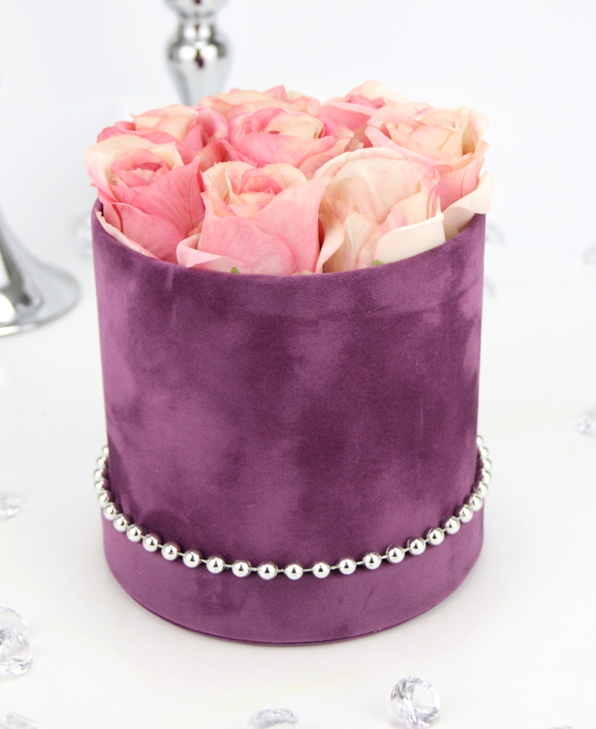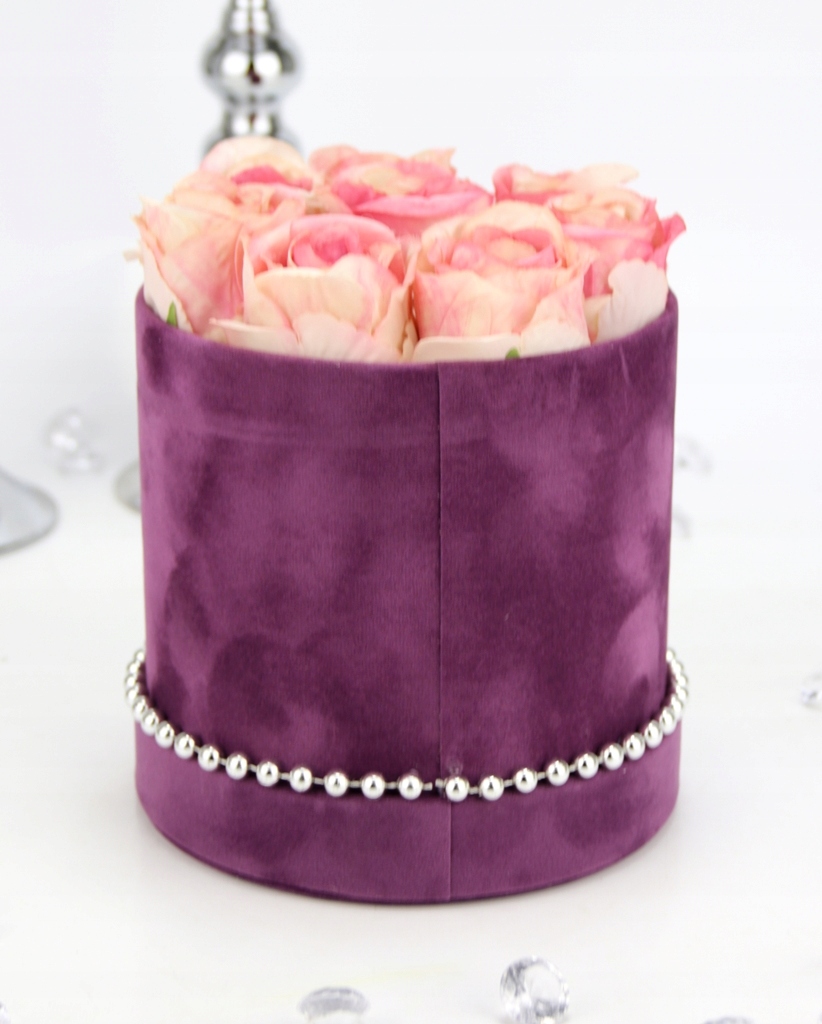 Podstawa bukietu, czyli pudełko jest z serii średniej, o kształcie klasycznej tuby w kolorze ciemnego fioletu, wykończonej w gładkim welurem. Na spodzie przymocowany jest na stałe dekielek od kompletu. Dookoła którego przymocowane są srebrne koraliki, pięknie podkreślają całą kompozycję i dodają jej elegancji.