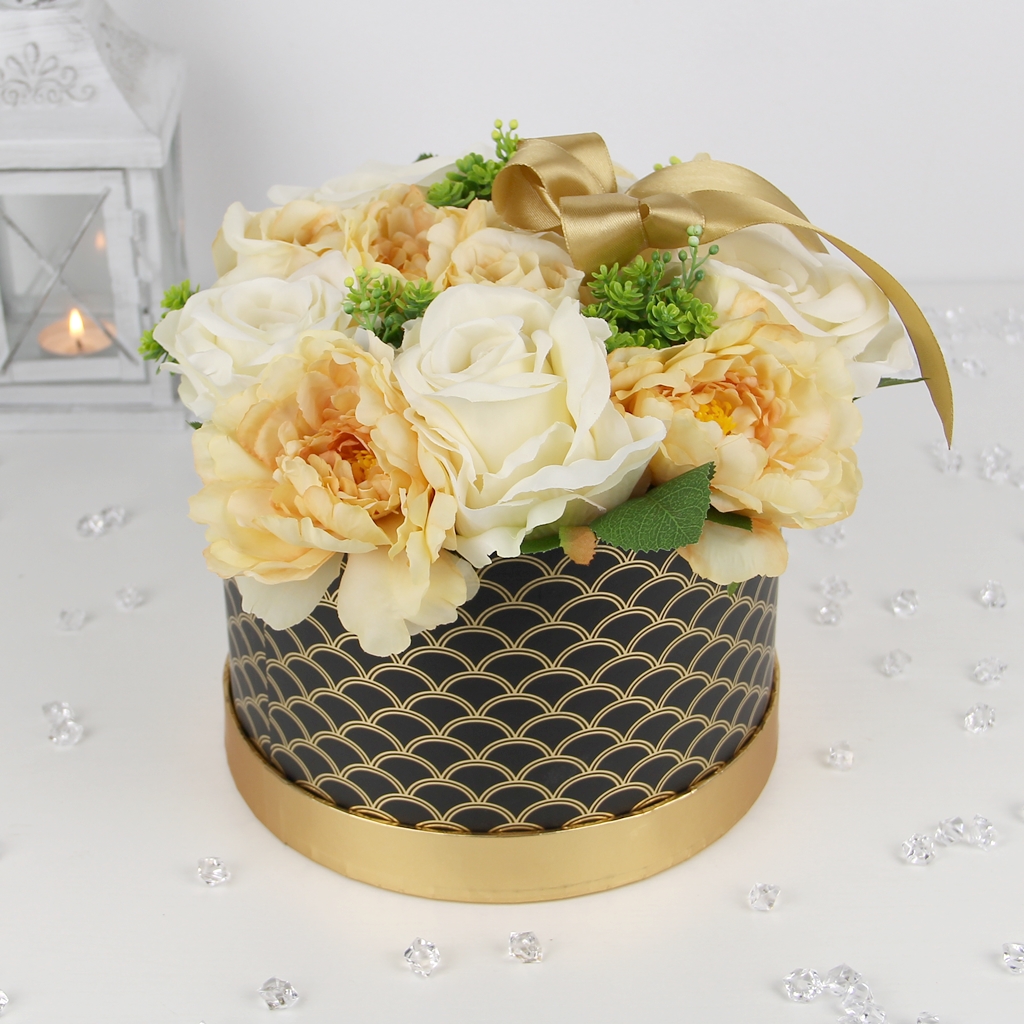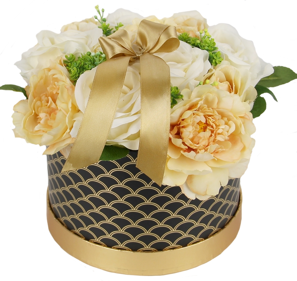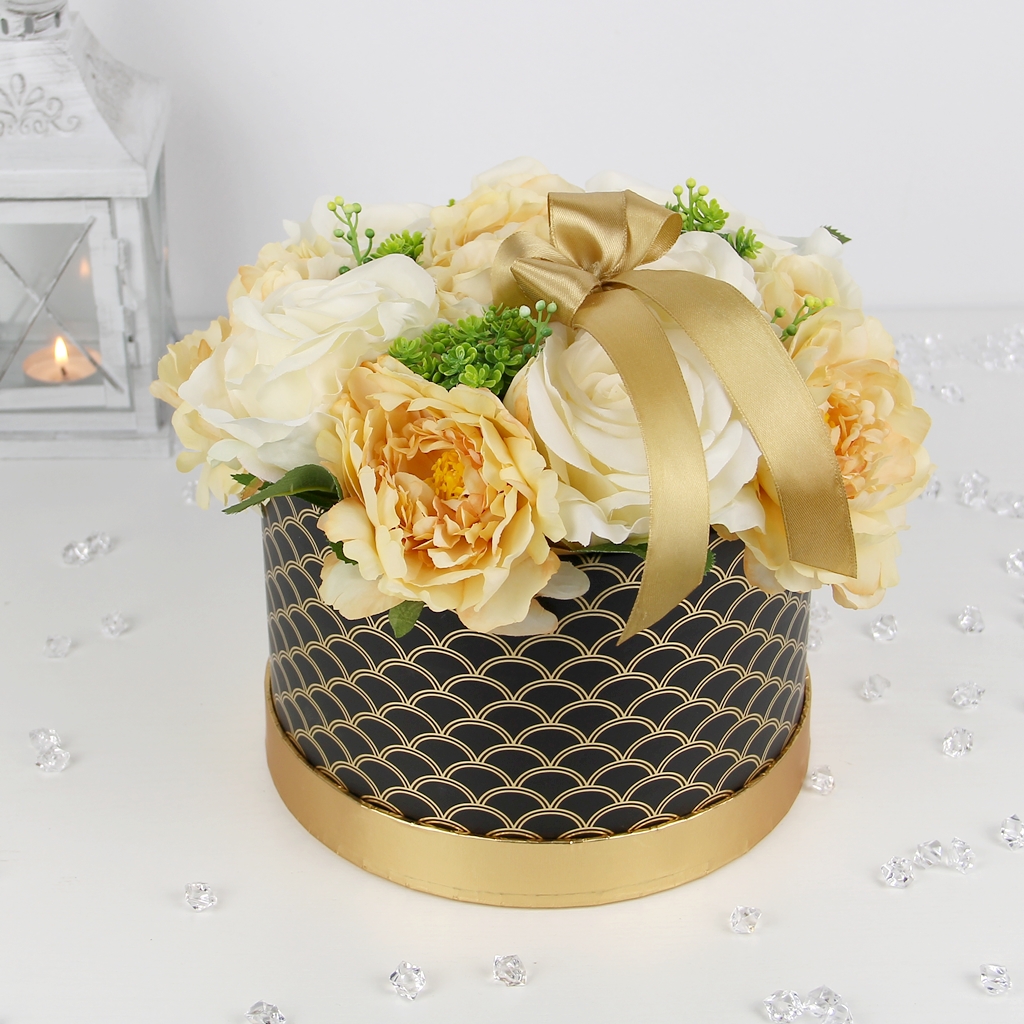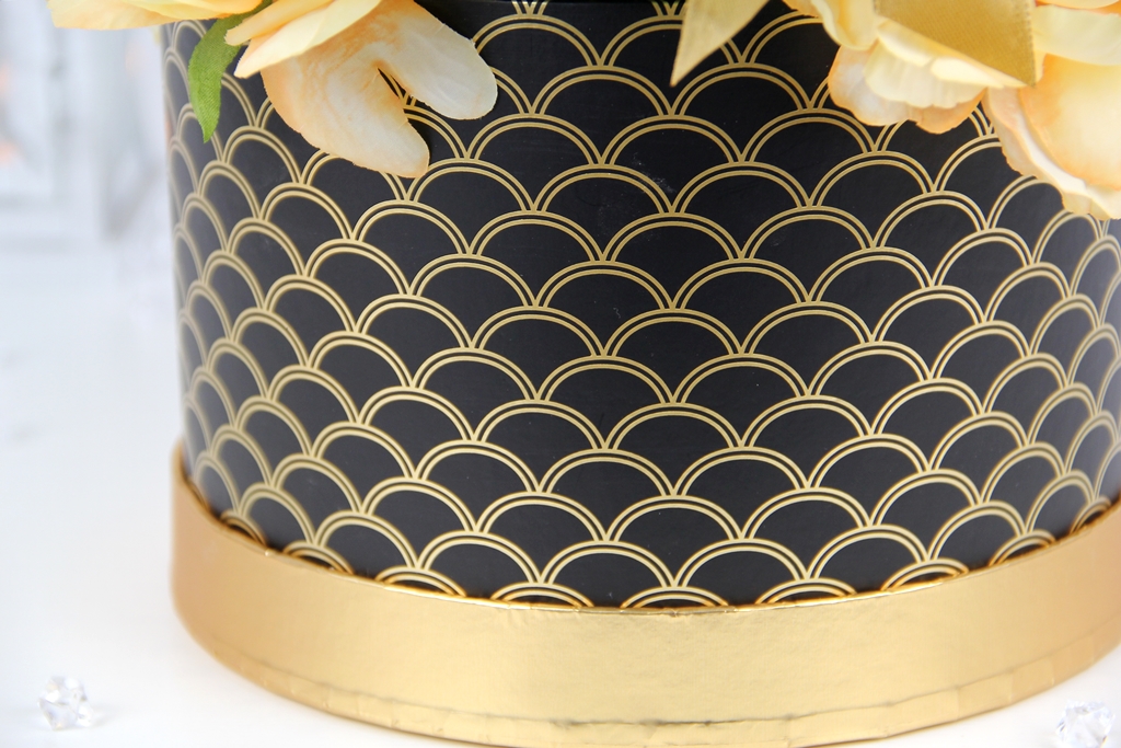 Pudełko jest z serii większej - rozmiar L wg. naszych oznaczeń. Kształt pudełka to klasyczna tuba w czarnym kolorze ze złotą aplikacją w wzór łuczków. Na spodzie pudełka przymocowany jest złoty satynowy dekielek, który pięknie podkreśla cały bukiet.