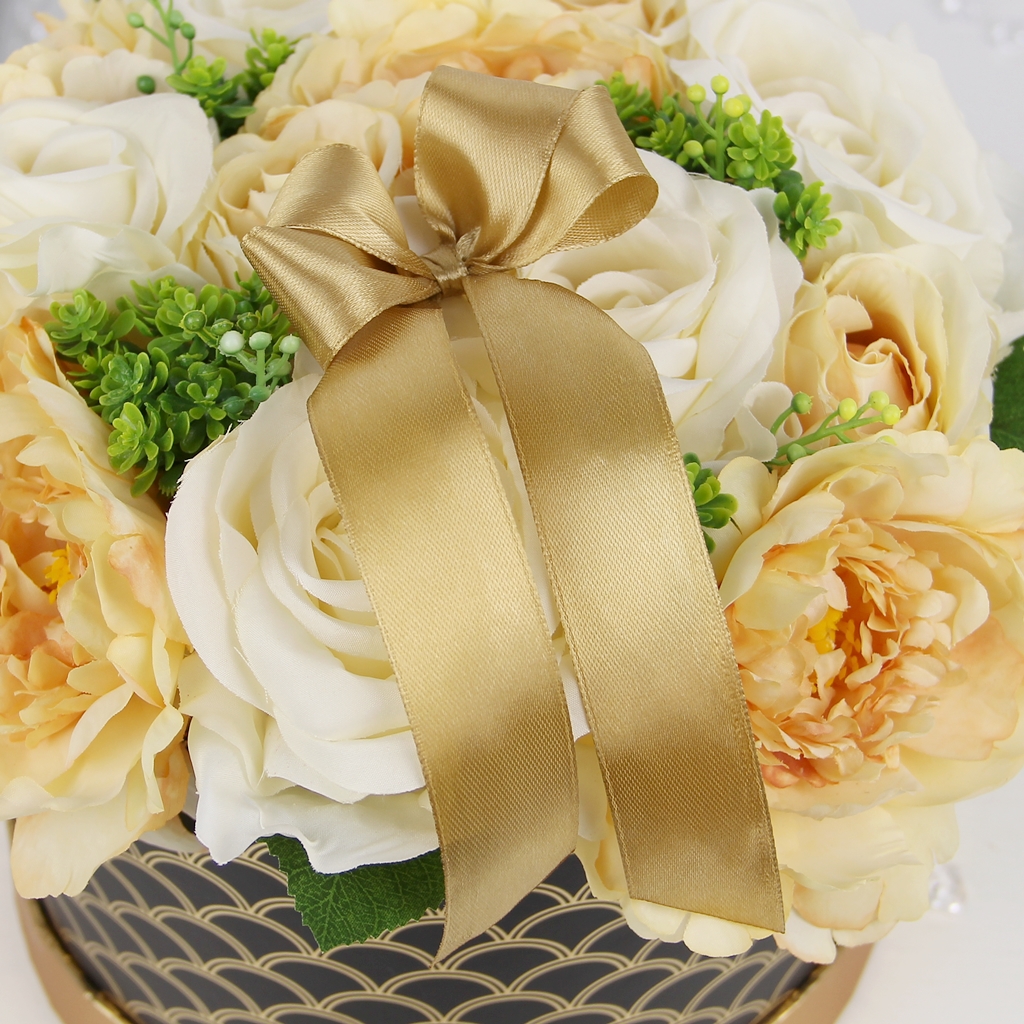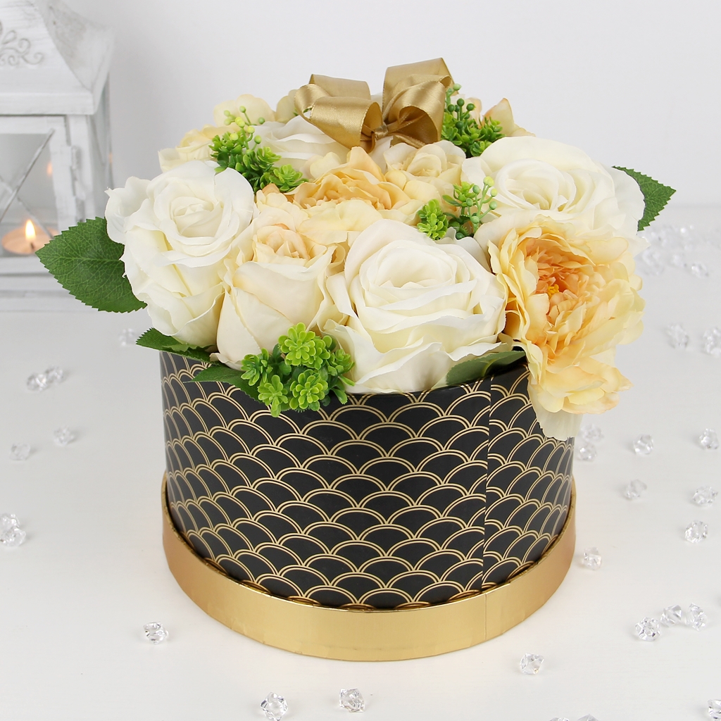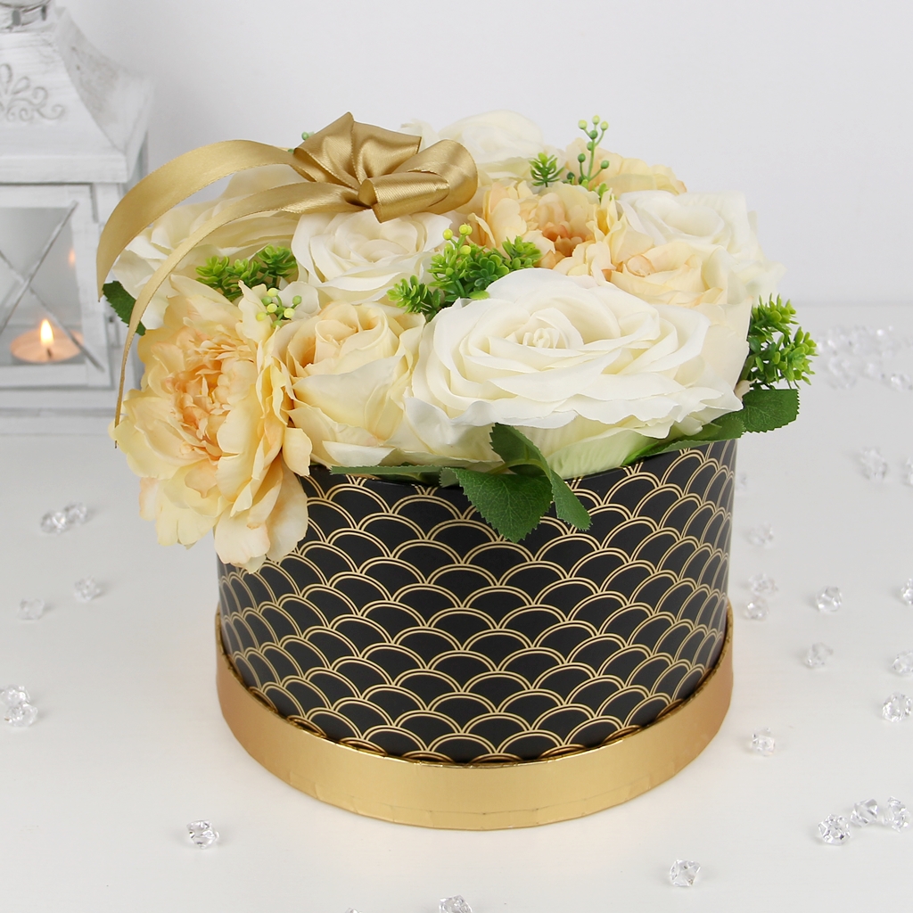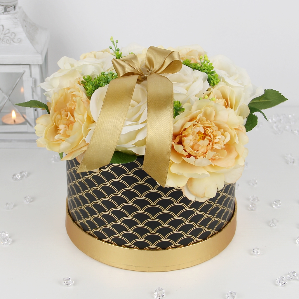 Pudełko jest z serii większej - rozmiar L wg. naszych oznaczeń. Kształt pudełka to klasyczna tuba w czarnym kolorze ze złotą aplikacją w wzór łuczków. Na spodzie pudełka przymocowany jest złoty satynowy dekielek, który pięknie podkreśla cały bukiet.