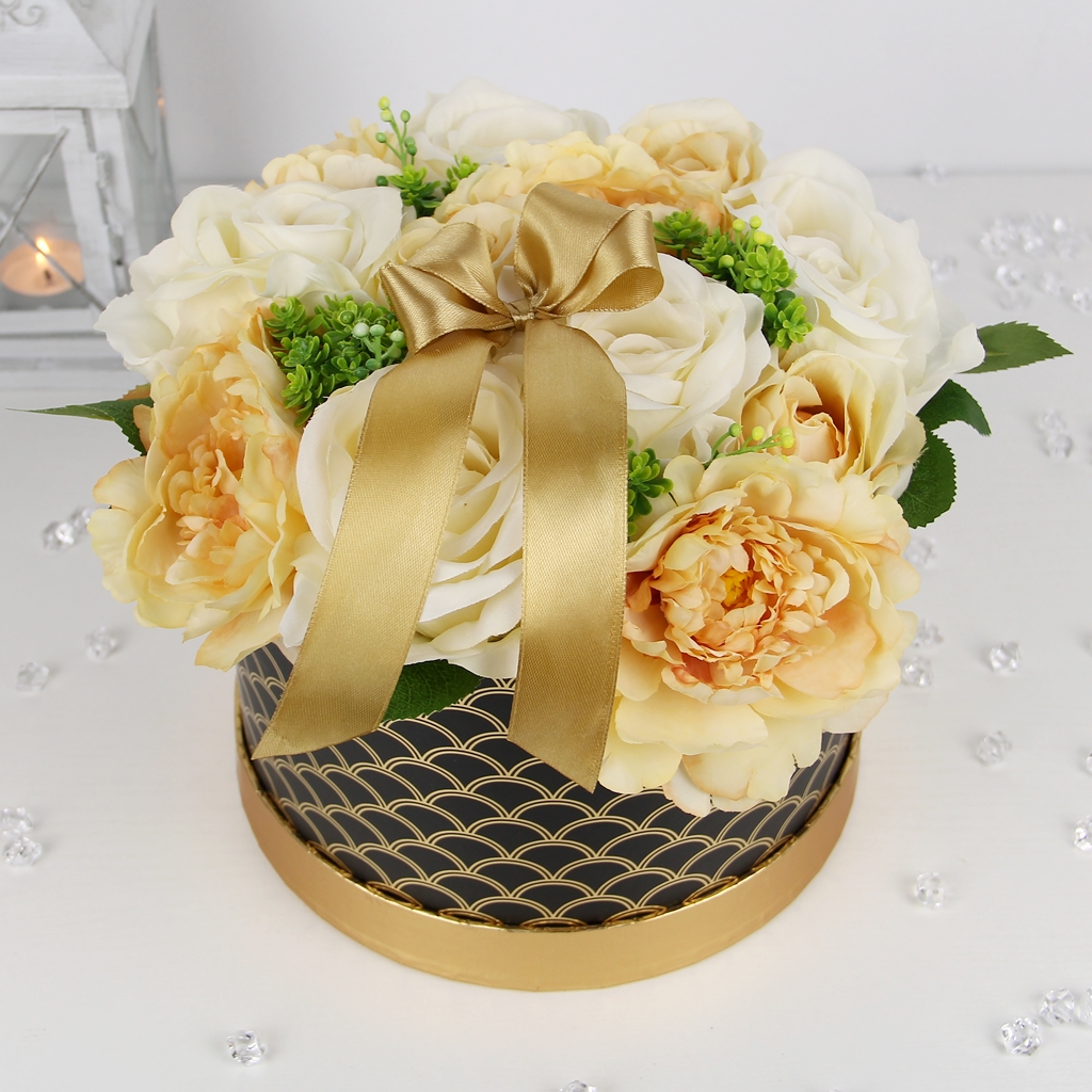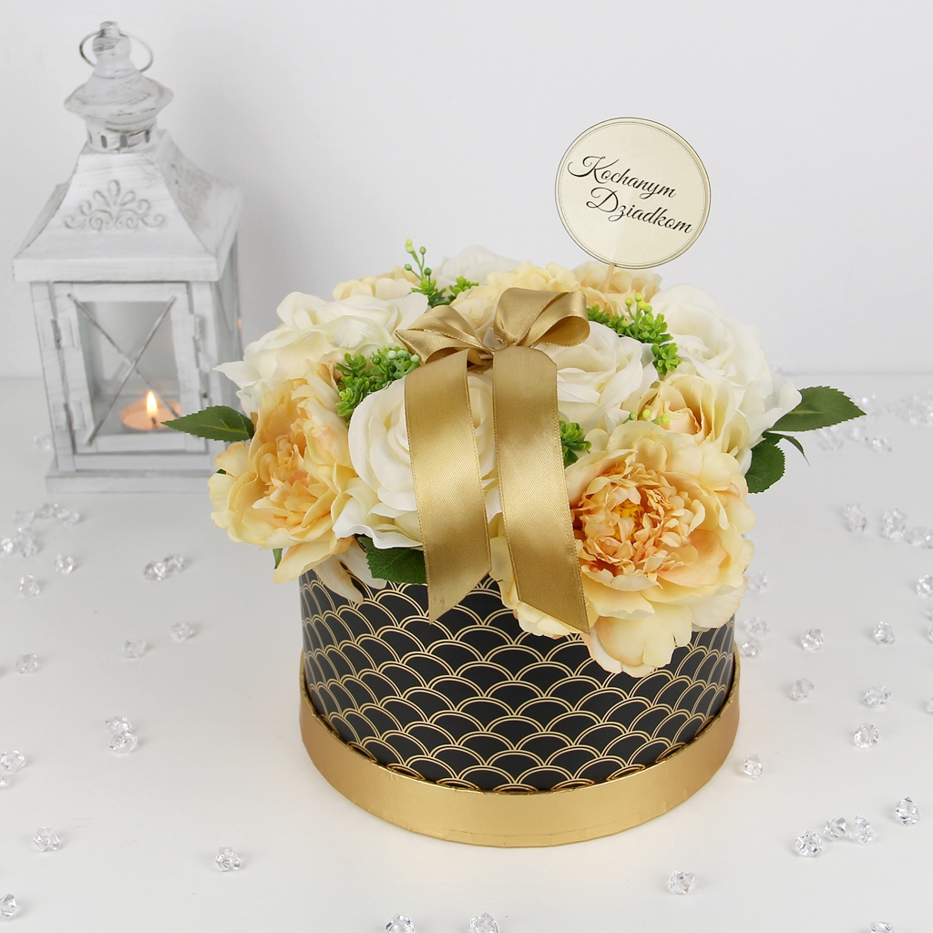 Ekskluzywny bukiet w pudełku Flower BOX - duże czarno - złote pudełko z SŁOMKOWYMI kwiatami premium z tkaniny - wyglądają jak ŻYWE!