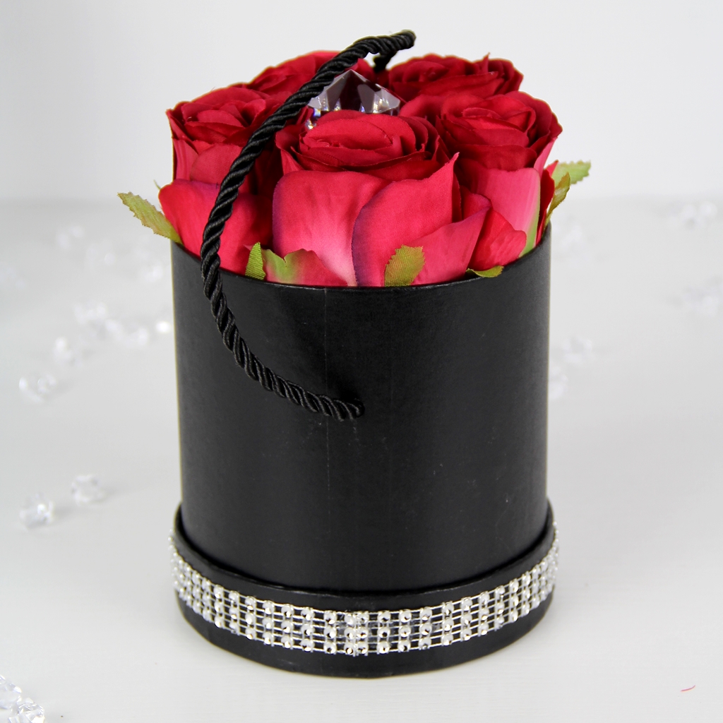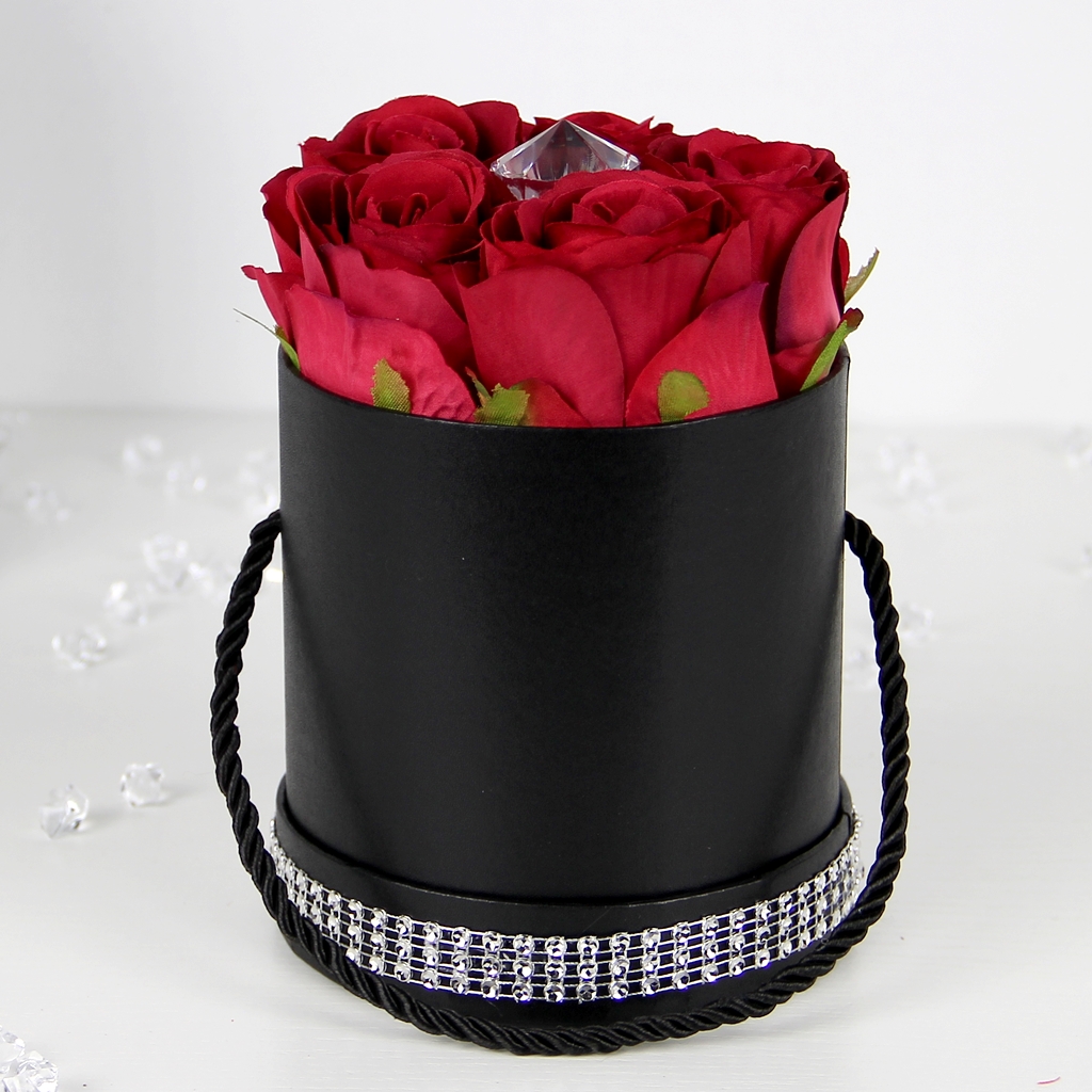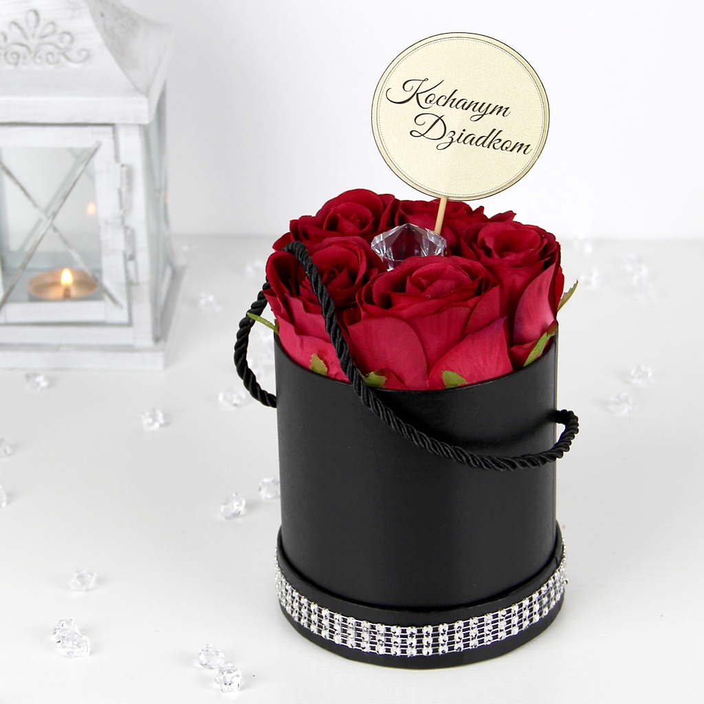 Ekskluzywny bukiet w pudełku FlowerBOX - CZARNY z srebrnymi cekinami z 5x czerwonymi RÓŻAMI premium z tkaniny - wyglądają jak ŻYWE!