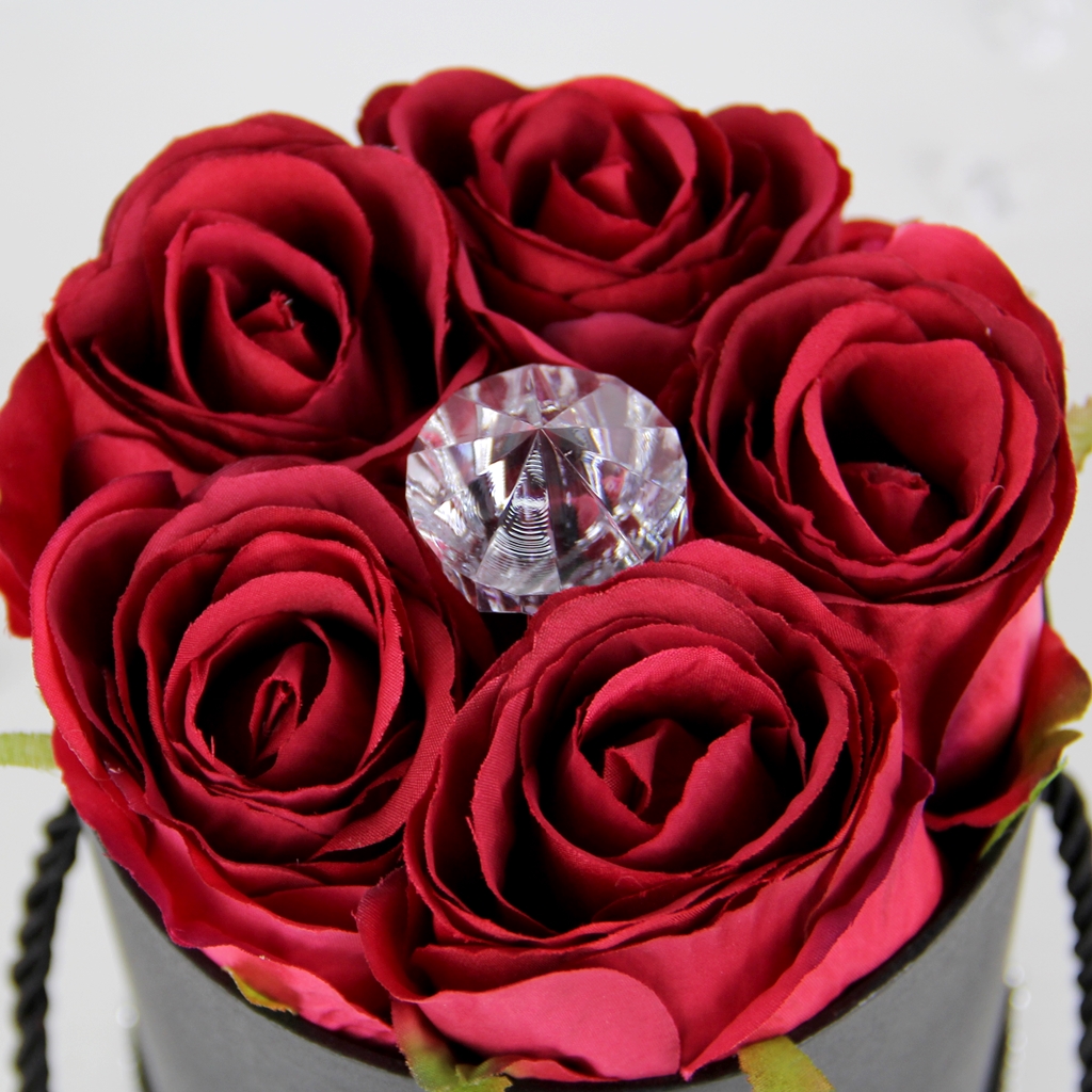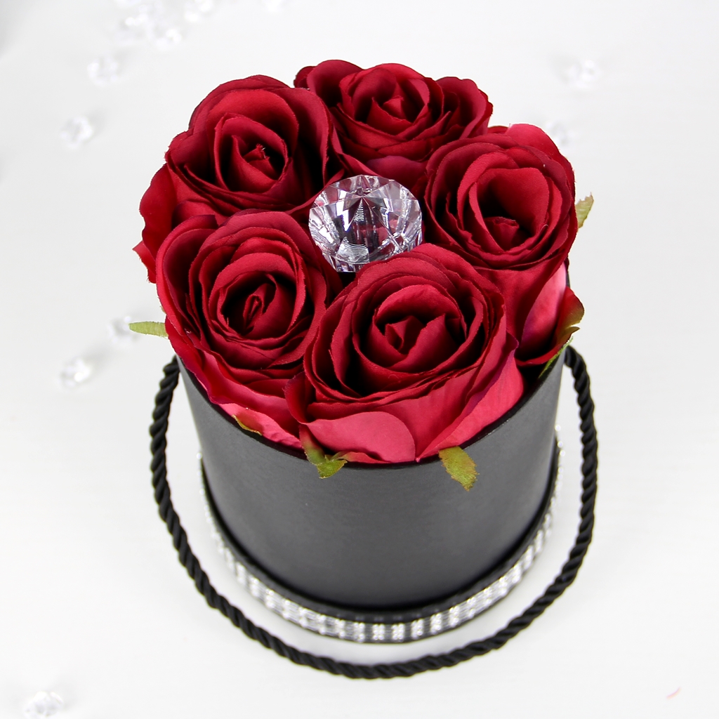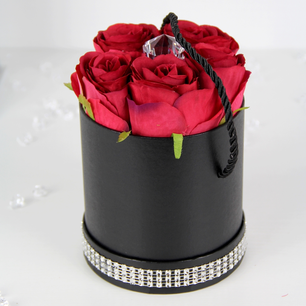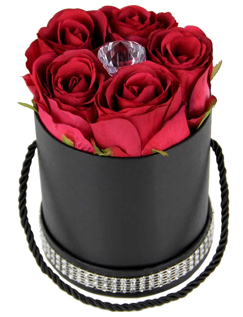 Ekskluzywny bukiet w pudełku FlowerBOX - CZARNY z srebrnymi cekinami z 5x czerwonymi RÓŻAMI premium z tkaniny - wyglądają jak ŻYWE!