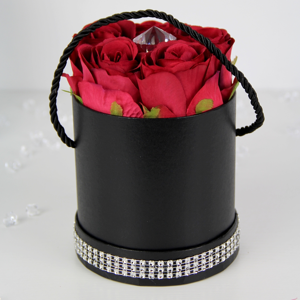 Pudełko jest z serii mniejszej - rozmiar XS wg. naszych oznaczeń. Kształt pudełka to klasyczna tuba w czarnym pół macie. Na spodzie przymocowany jest dekielek dookoła którego puszczony jest srebrzysty pasek imitujący błyszczące cekiny. Dzięki temu całość bukietu jest niesamowicie podkreślona i bardzo elegancka. Pudełko posiada też uchwyt w formie czarnego skręcanego sznurka.