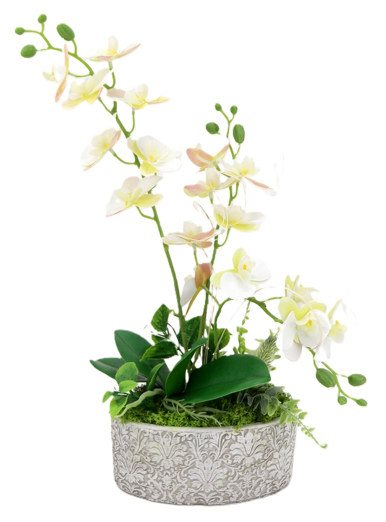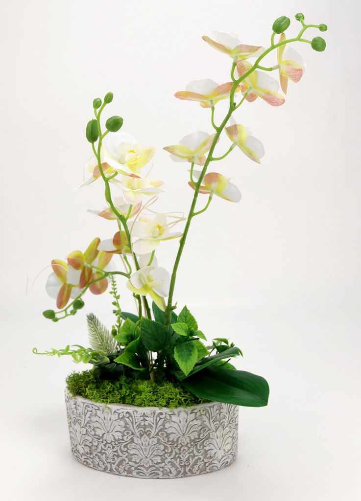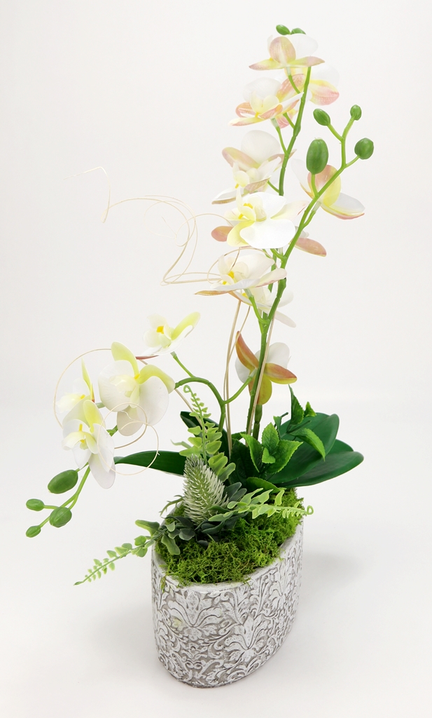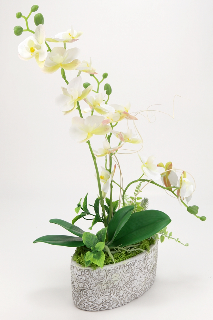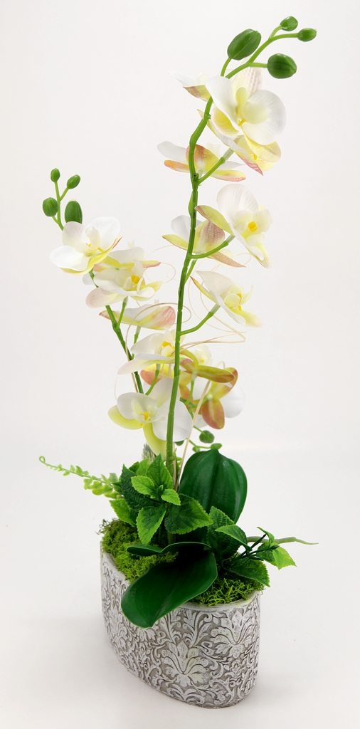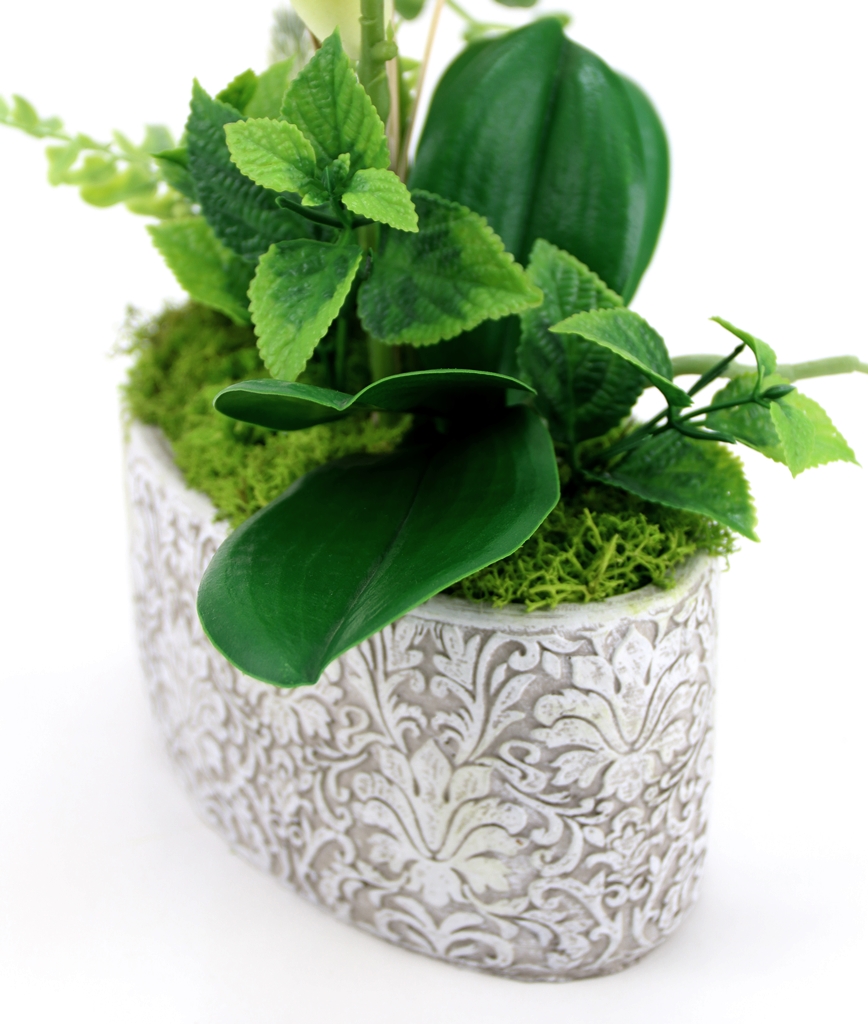 Kompozycja sztuczne GUMOWE STORCZYKI w owalnej betonowej osłonce prosto z naszej pracowni florystycznej