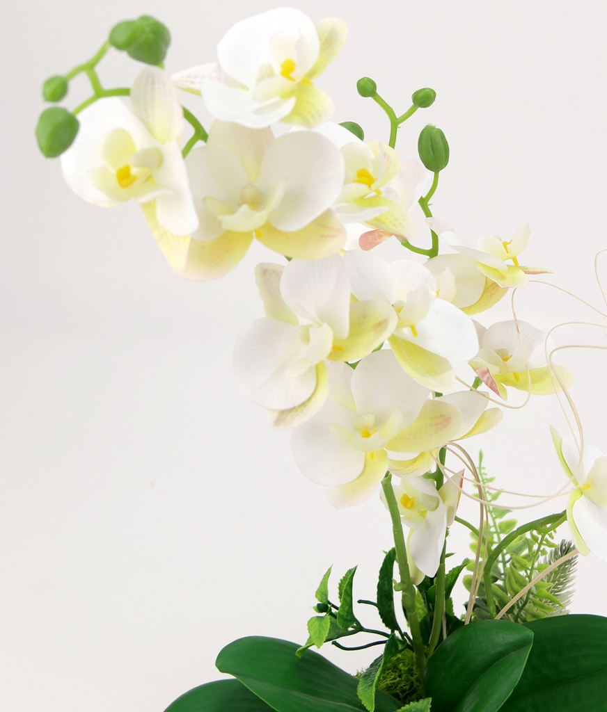 pomiędzy pędami storczyków przeplecione są wywijaski z naturalnego rattanu,