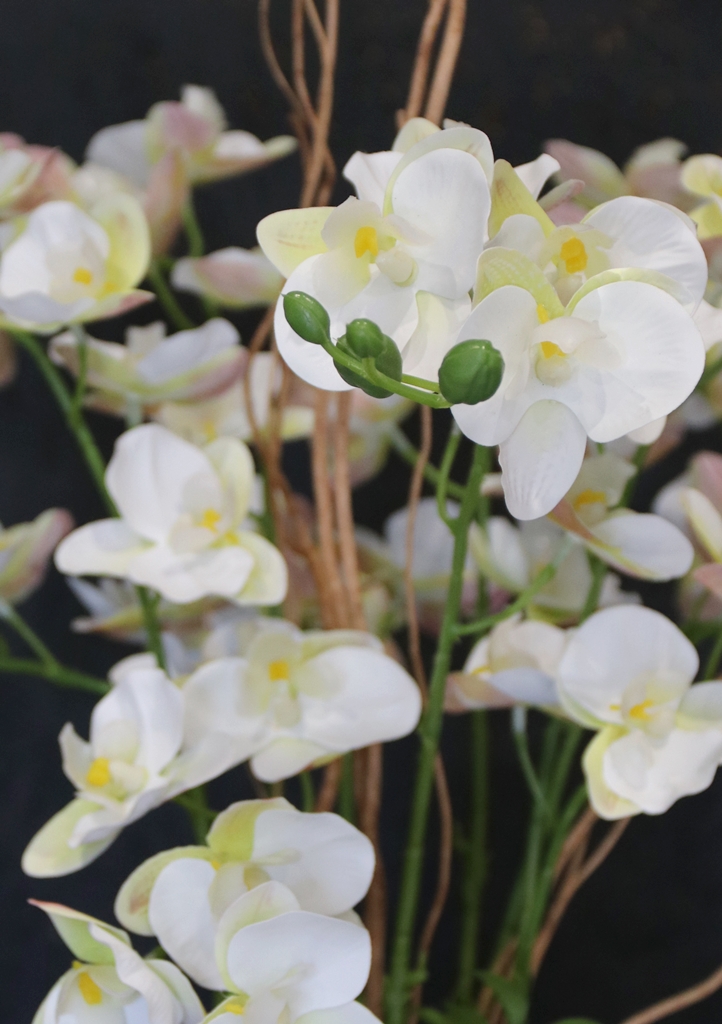 - pomiędzy storczykami wpięliśmy też sztuczne łodyżki zielonego ruskusu,