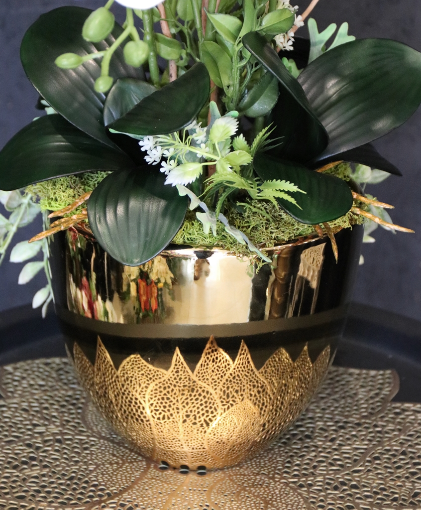 Osłonka - doniczka jest w kolorze złotym - jednolitym z efektem chrom (lustro), więc na zdjęciach odbija się w niej ozdobna koronkowa podkładka.