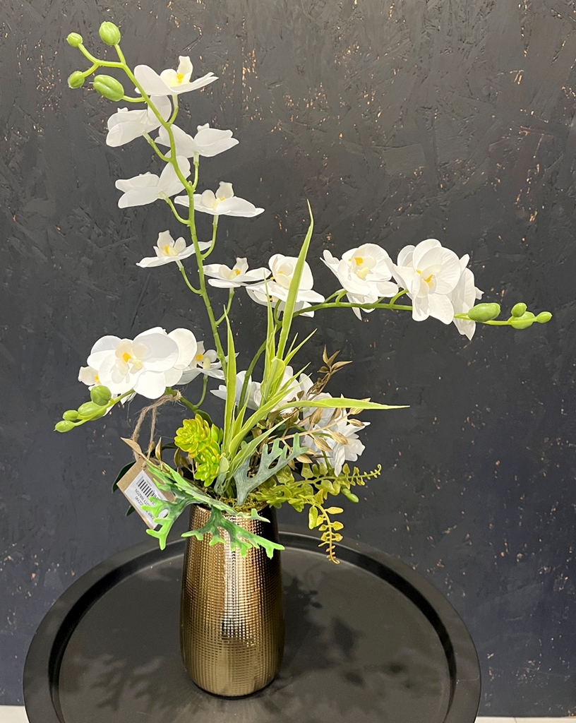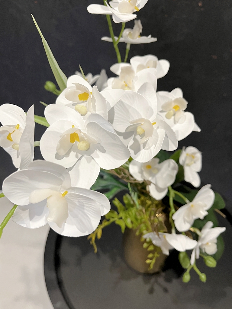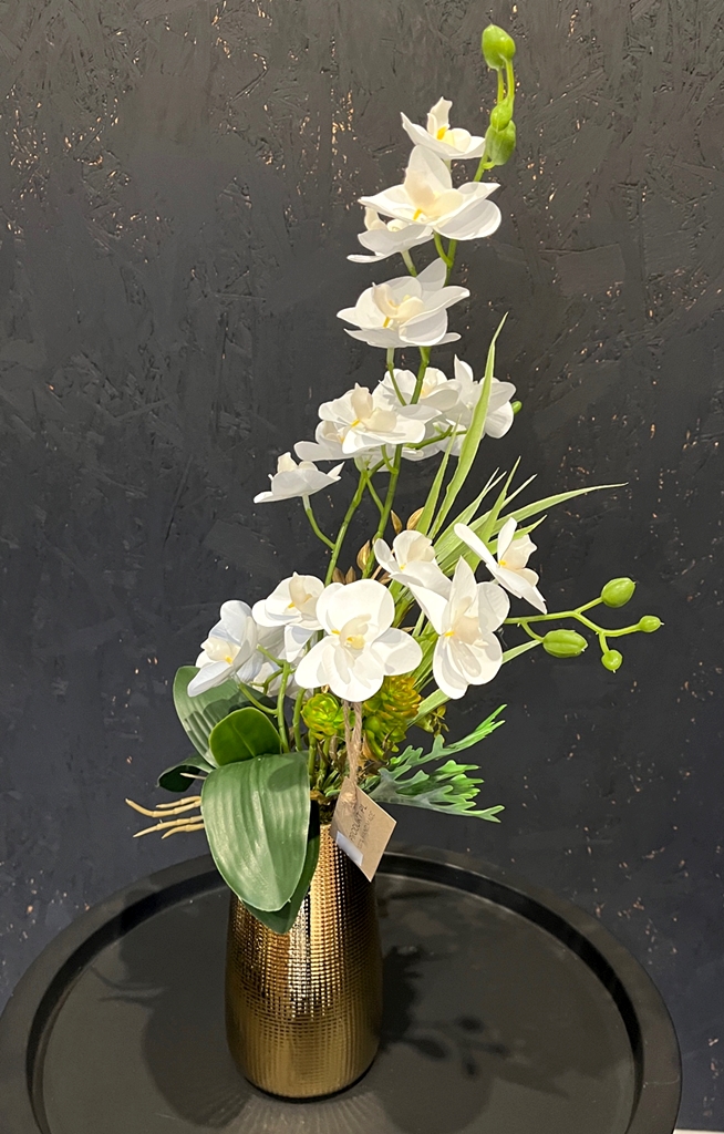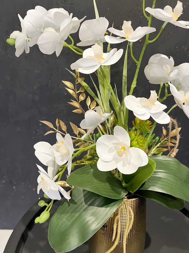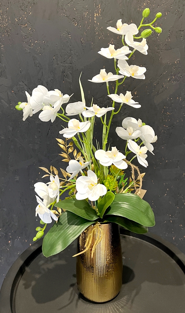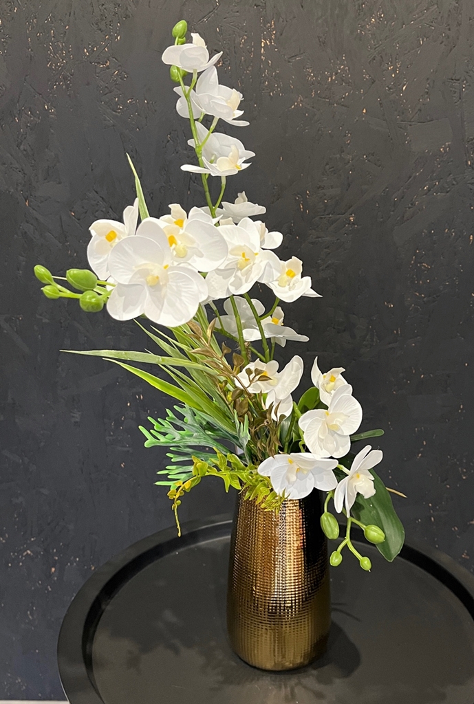 Ponadczasowa, bezobsługowa dekoracja ze sztucznych storczyków premium. Nie wymaga podlewania, nawożenia, pięknie się prezentuje na żywo. Idealne rozwiązanie jeżeli chcesz mieć zawsze kwitnącego stoczyka! Kompozycja nadaje się jako ozdoba do domu, biura, recepcji, poczekalni, sprawdzi się też jako wyjątkowy prezent. Wykonana na podstawie pięknego złotego wazonu z ryflowanym prostym wzorem kratki, który ciekawie rozbija światło.