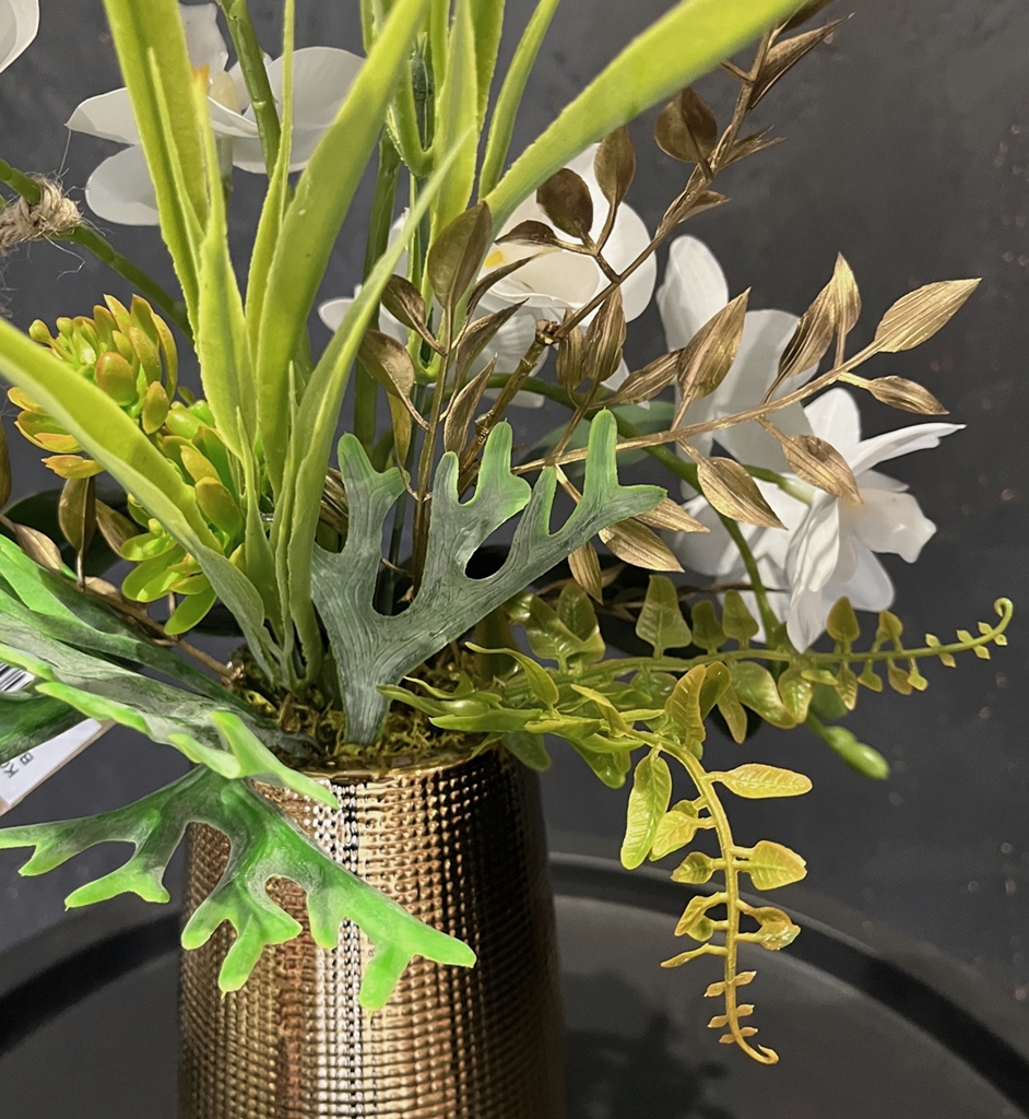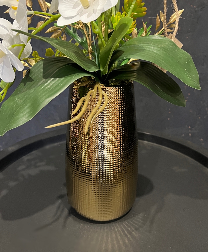 - całość mocowana jest w ceramicznym wazonie w eleganckim złotym kolorze z ryflowanym przetłoczeniem a'la kratka,