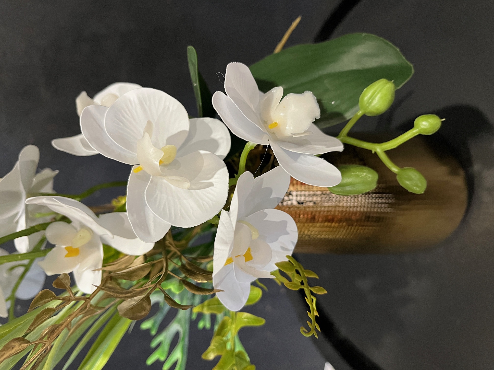 - pomiędzy storczykami wpięliśmy też sztuczne łodyżki jasno zielonej trawy,