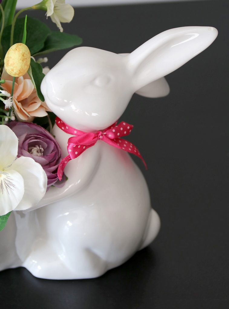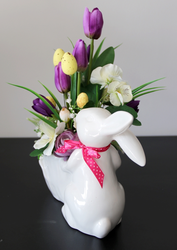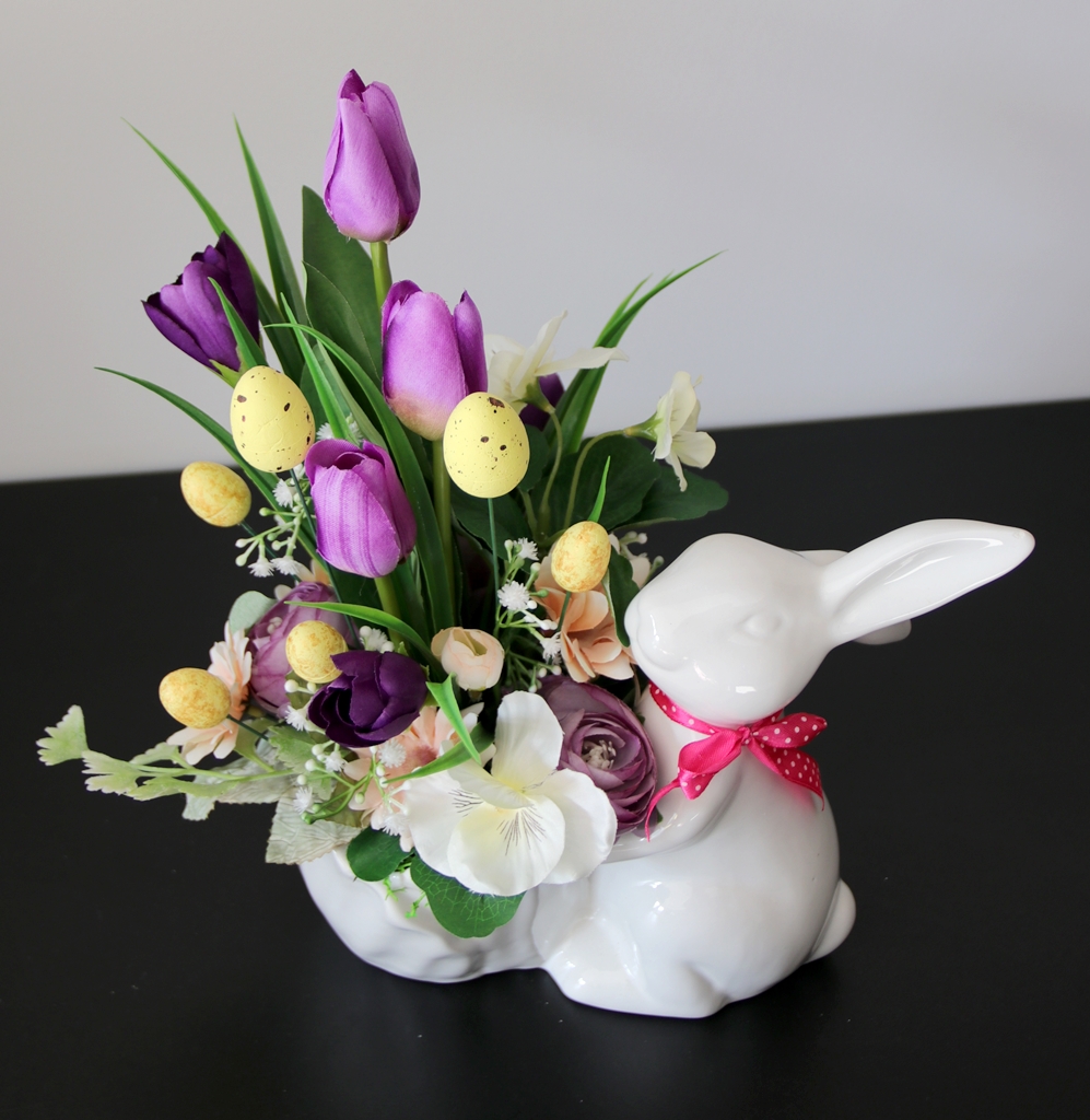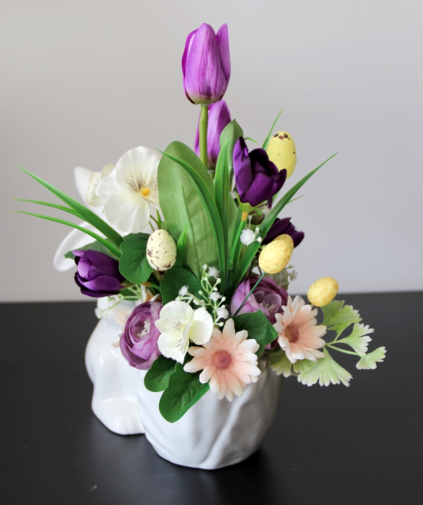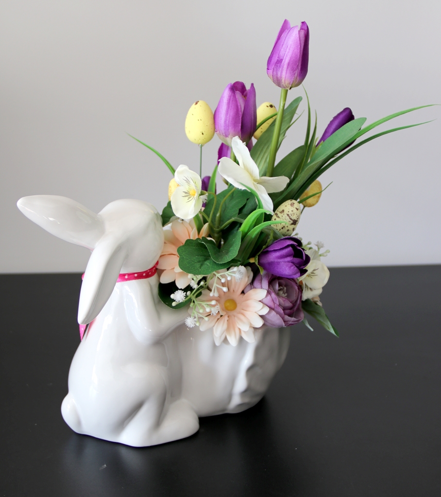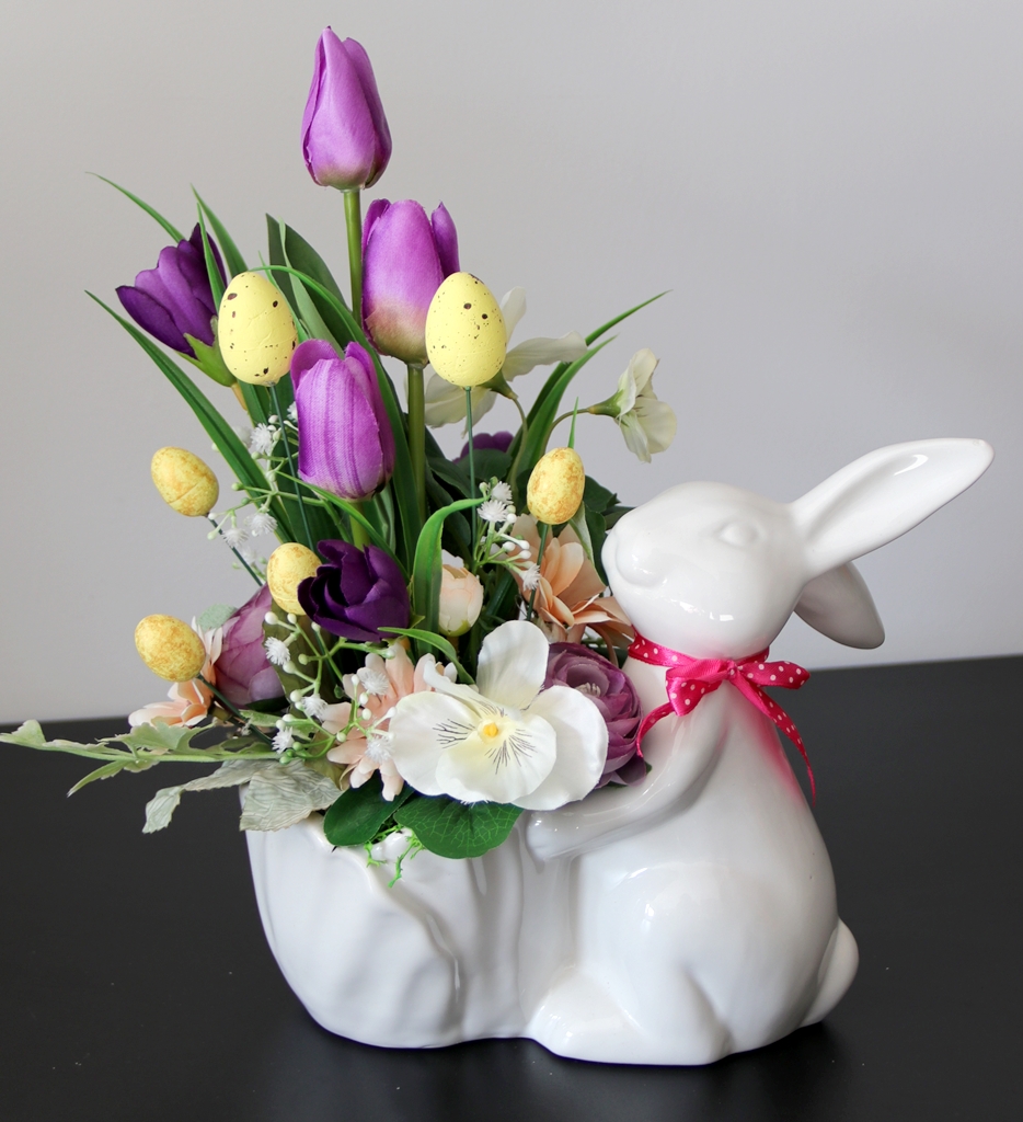 Niepowtarzalna dekoracja wiosenna w ceramicznej osłonce w kształcie ZAJĄCA trzymającego przed sobą doniczkę, którą wypełniliśmy kwiatami tulipanów, bratków, margaretki, krokusików i pełników oraz łodyżkami gipsówki.