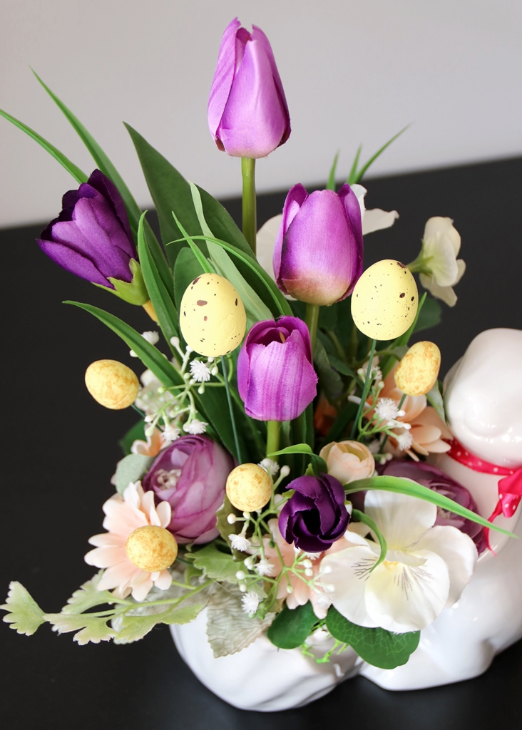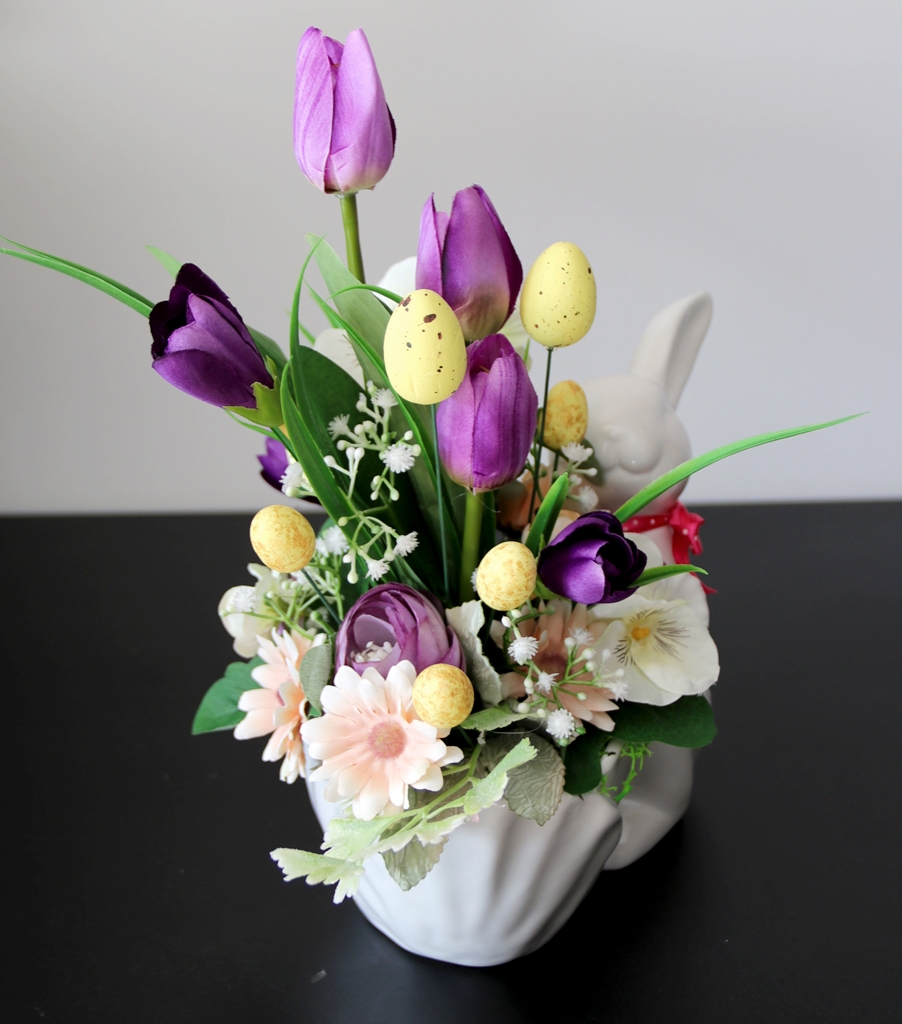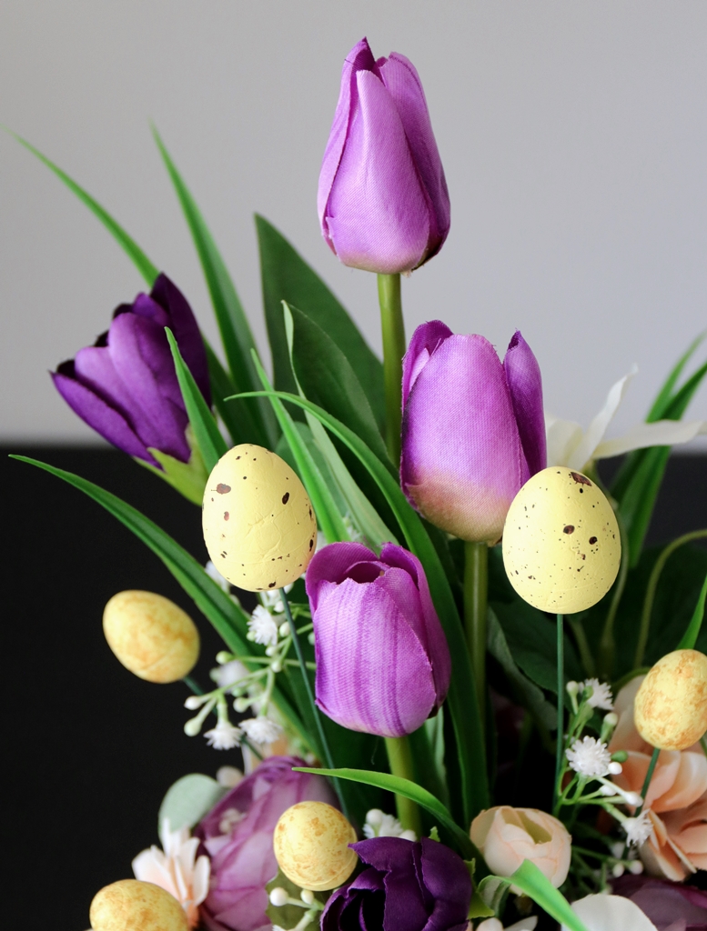 • pomiędzy kwiatami wpięte są sztuczne, kolorowe jajeczka ze styropianu.