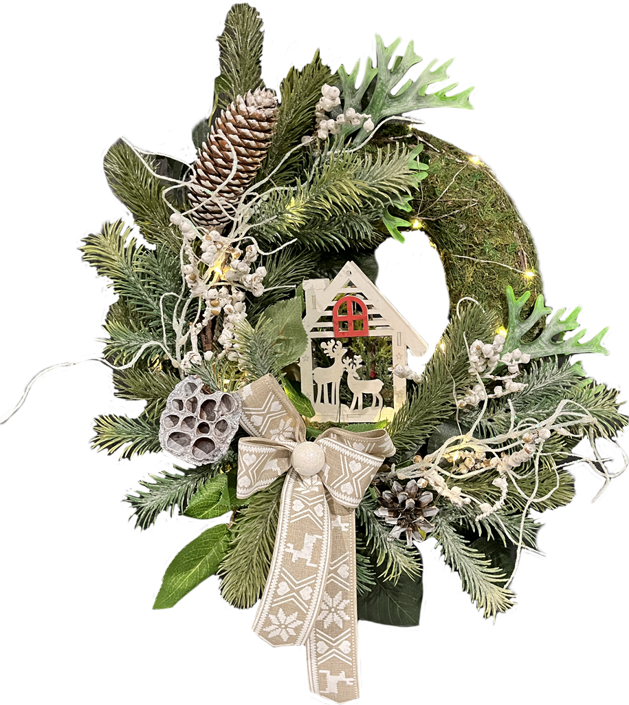 Mszakowy wianek udekorowany sztucznymi gałązkami świerkowymi, liśćmi róży, imitacji łosich rogów, naturalnym suszem z szyszek, lotosu i gałązki z drobnymi kulkami, po środku z drewnianym domkiem z reniferami, kokardą z jutowej wstążki świątecznej oraz lampkami LED.