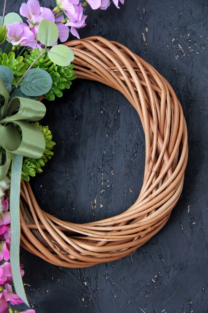 Podstawą jest gruby pleciony wianek z jasno-brązowych wiklinowych witek o średnicy ~25cm.