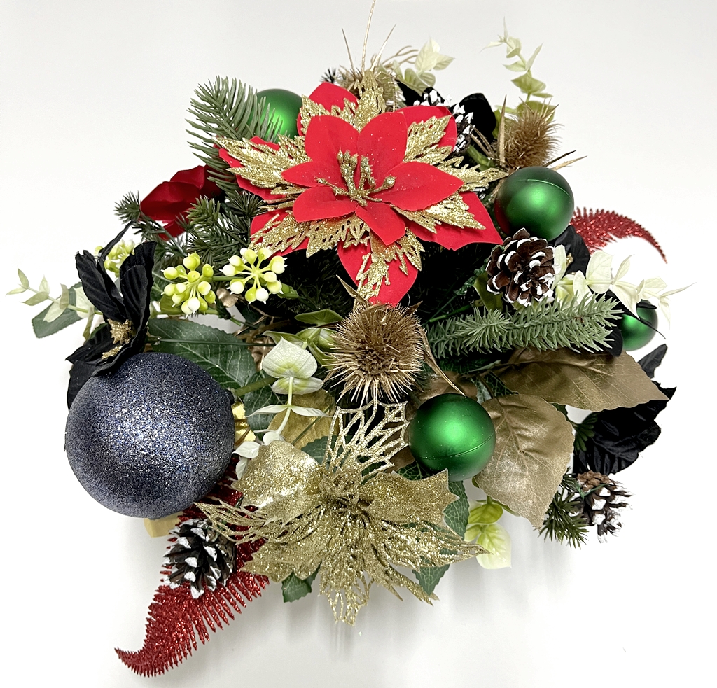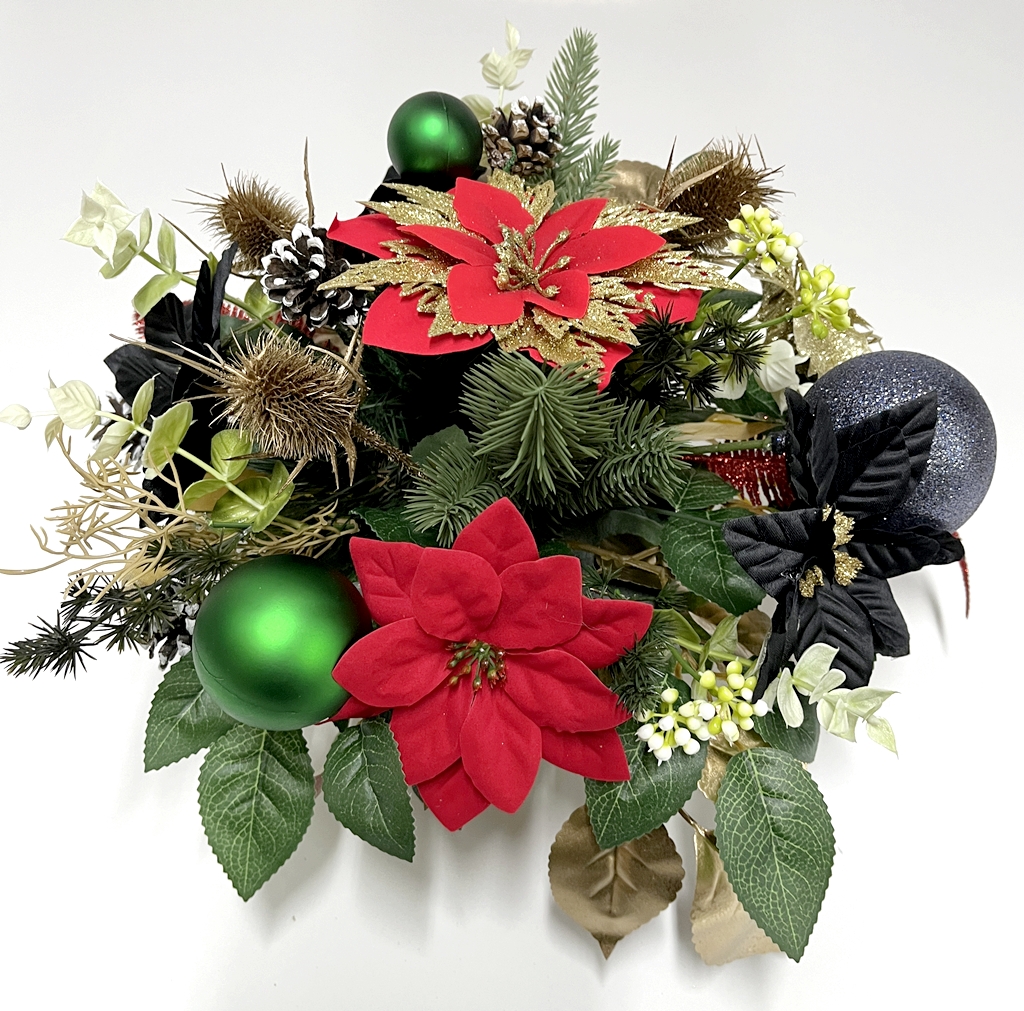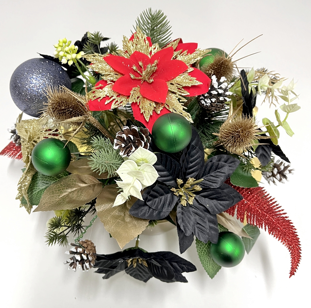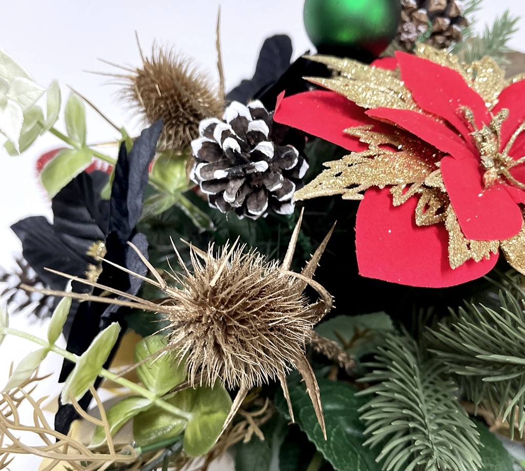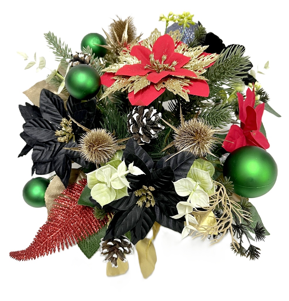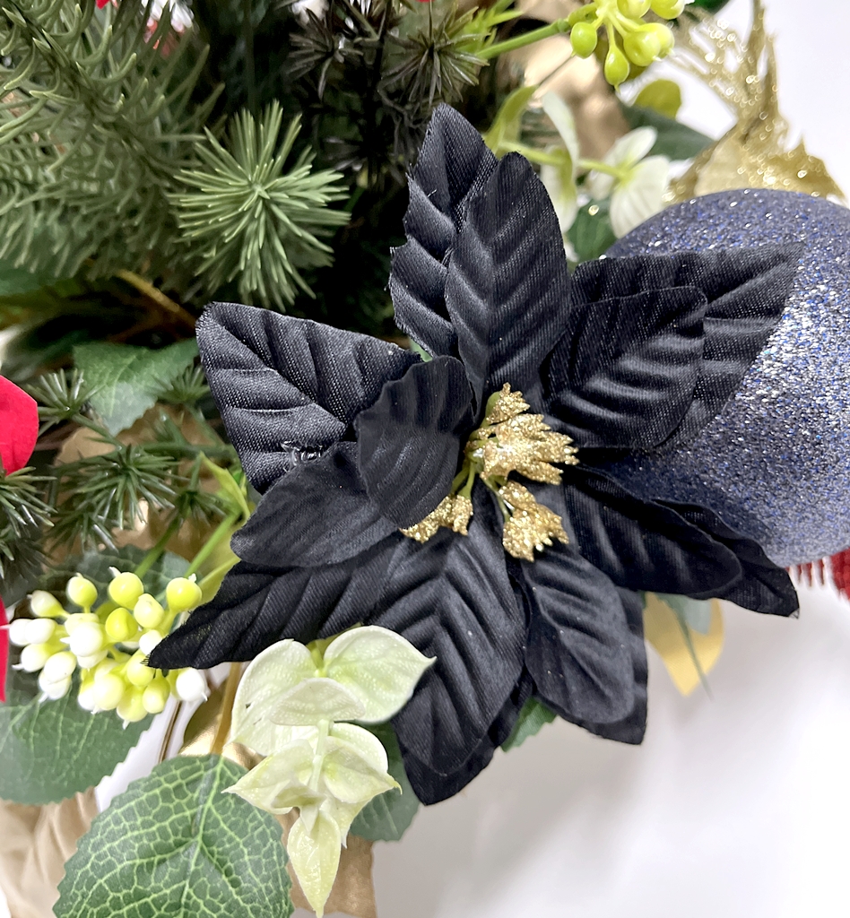 Wiązanka powstała w naszej pracowni z wysokiej jakości kwiatów i dodatków. Użyliśmy tutaj kilku rodzajów sztucznych kwiatów gwiazdy betlejemskiej: czerwonej welurowej ze złotymi brokatowymi płatkami, satynowych czarnych, welurowej czerwonej oraz złotej brokatowej.